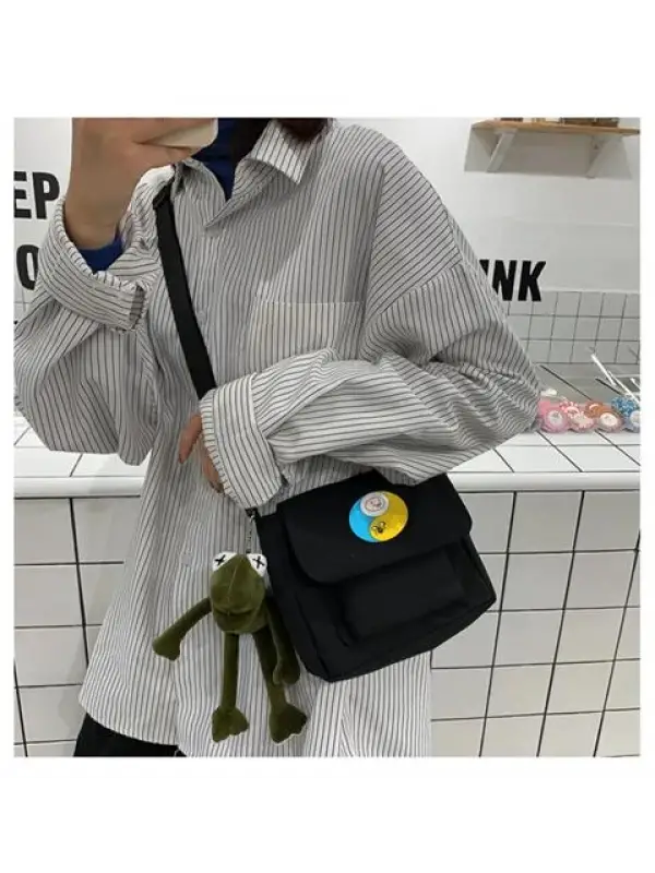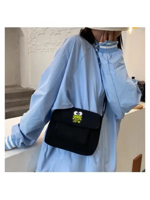 Confused Frog Baskılı Cep Detaylı Unisex Kanvas Siyah Omuz Çantası