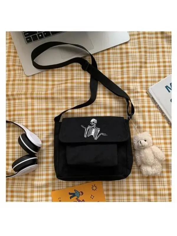 Confused Skeleton Baskılı Cep Detaylı Unisex Kanvas Siyah Omuz Çantası
