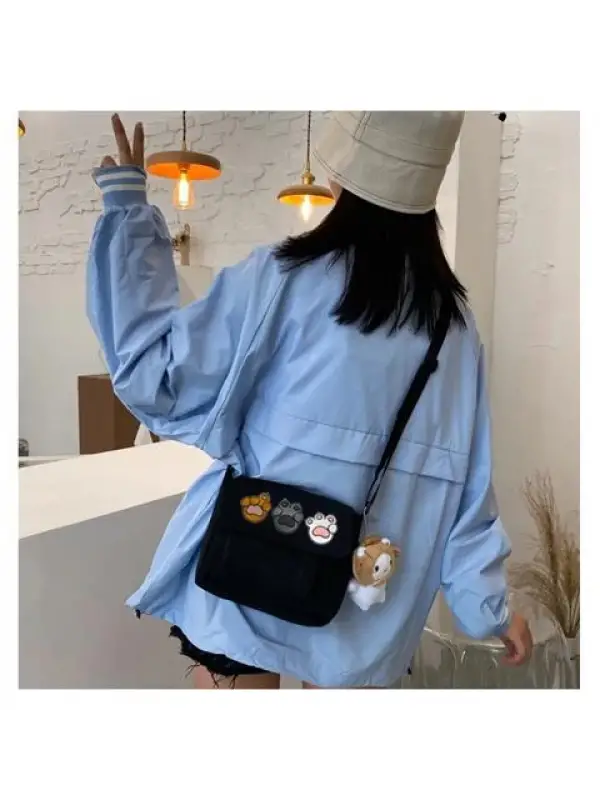 Cute Paws Baskılı Cep Detaylı Unisex Kanvas Siyah Omuz Çantası