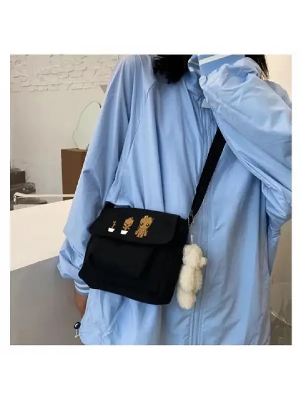 Groot Baskılı Cep Detaylı Unisex Kanvas Siyah Omuz Çantası