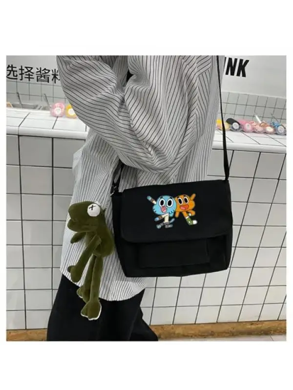 Gumball Baskılı Cep Detaylı Unisex Kanvas Siyah Omuz Çantası