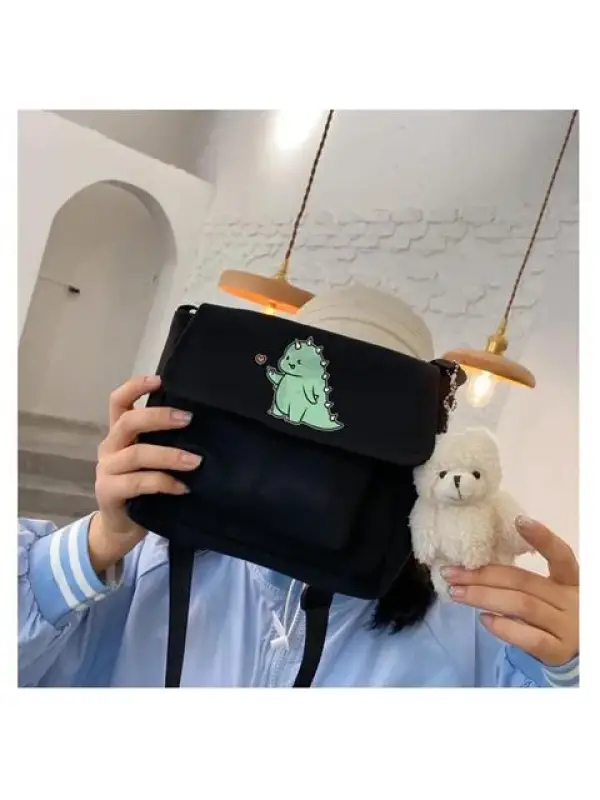 Kawaii Dinosaur Heart Baskılı Cep Detaylı Unisex Kanvas Siyah Omuz Çantası