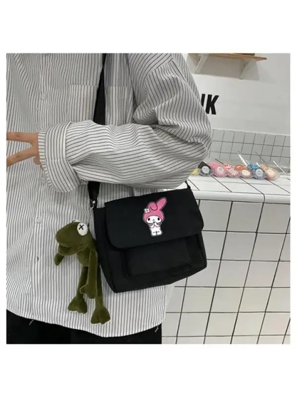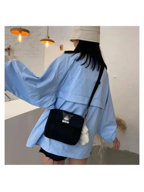 Kuromi Sitting Baskılı Cep Detaylı Unisex Kanvas Siyah Omuz Çantası