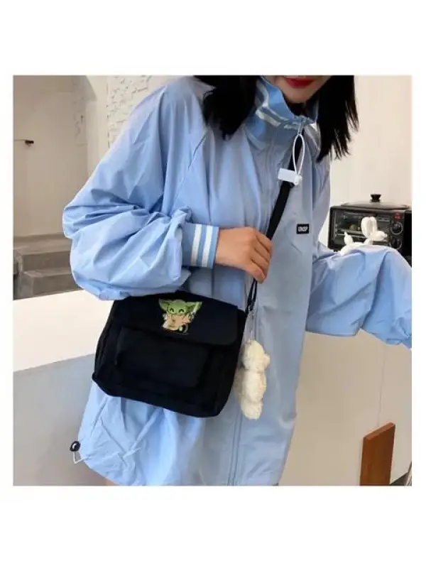 Yoda Baskılı Cep Detaylı Unisex Kanvas Siyah Omuz Çantası