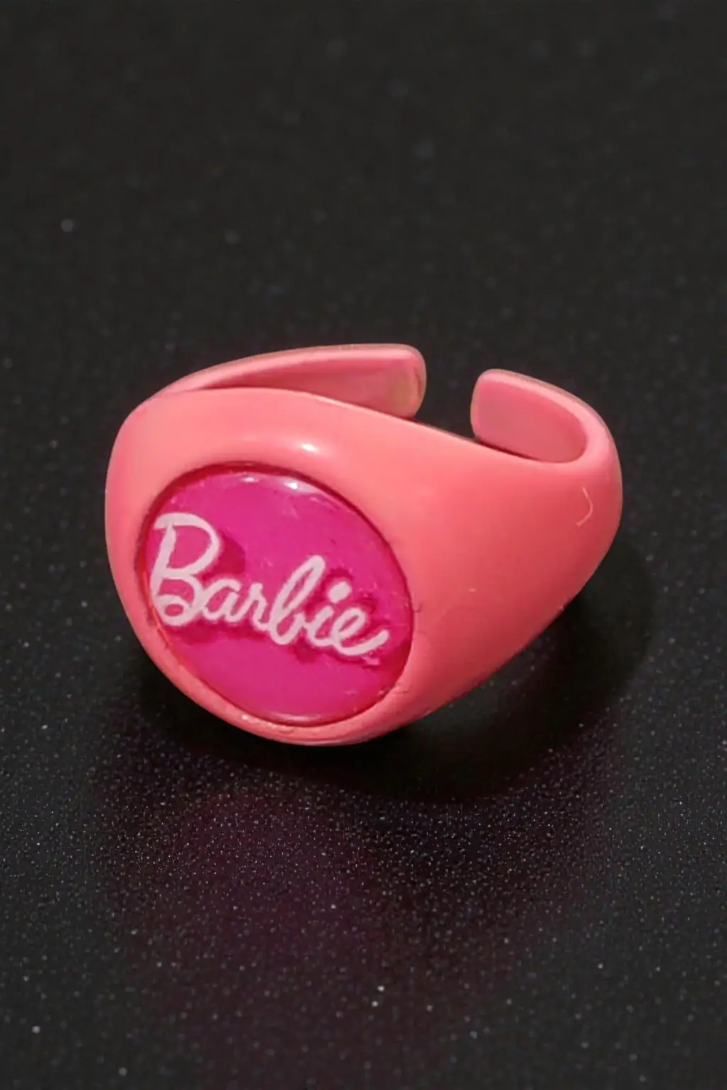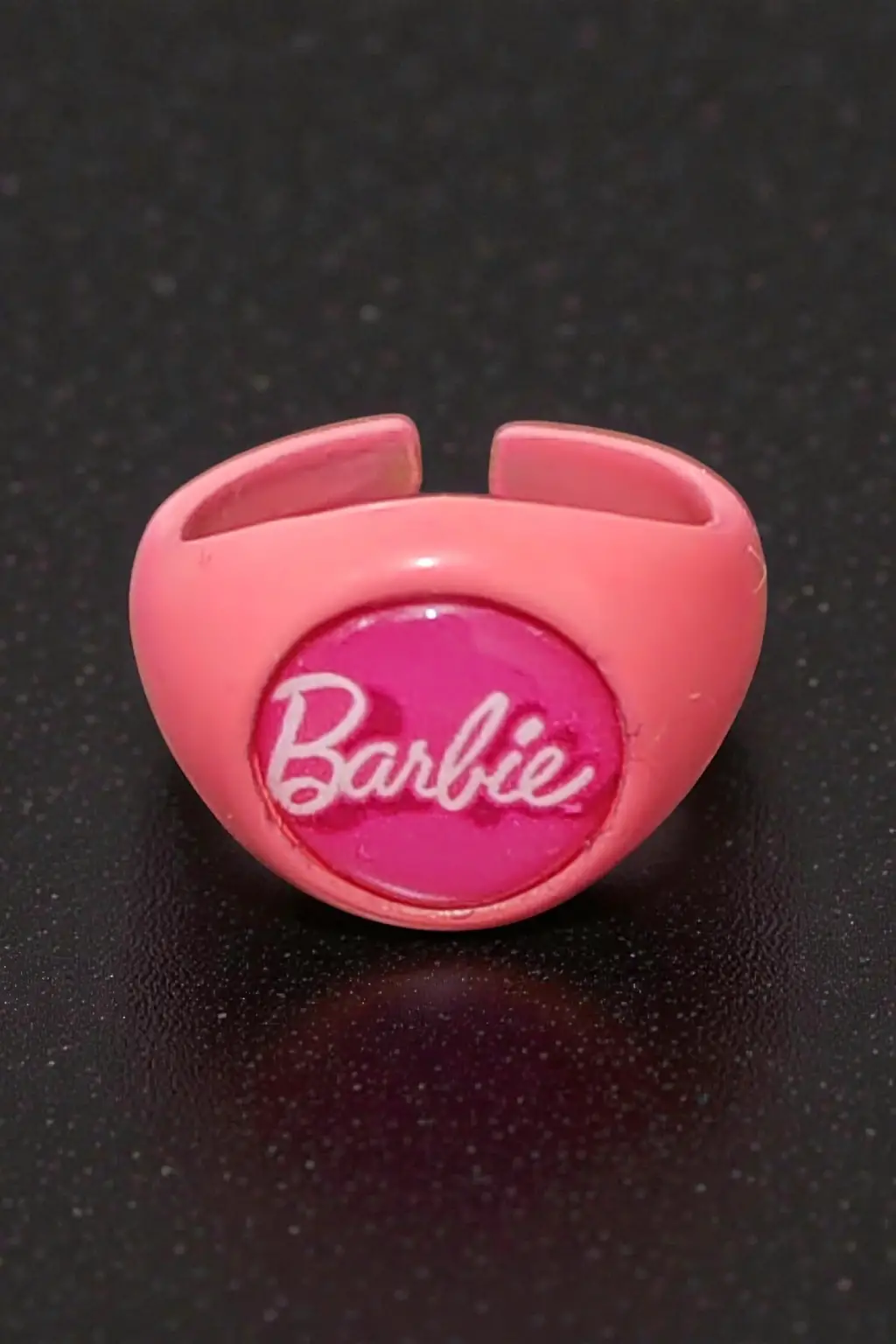 Pembe Barbie Yazılı ve Logolu Yüzük - Siyah Yuvarlak Detaylı Retro Aksesuar, göz alıcı tasarımıyla her yaş grubundan kadının beğenisini kazanmaktadır.
