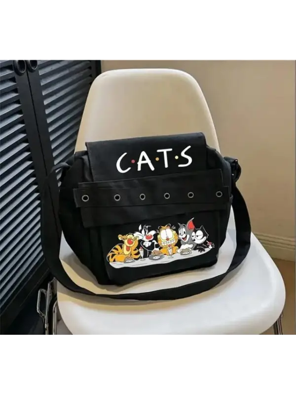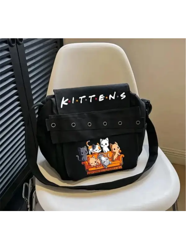 Siyah Kuş Gözlü Kittens Baskılı Postacı Çantası