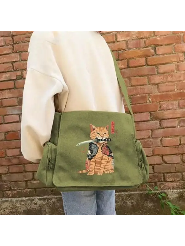 Killer Cat Baskılı Unisex Yeşil Postacı Çantası
