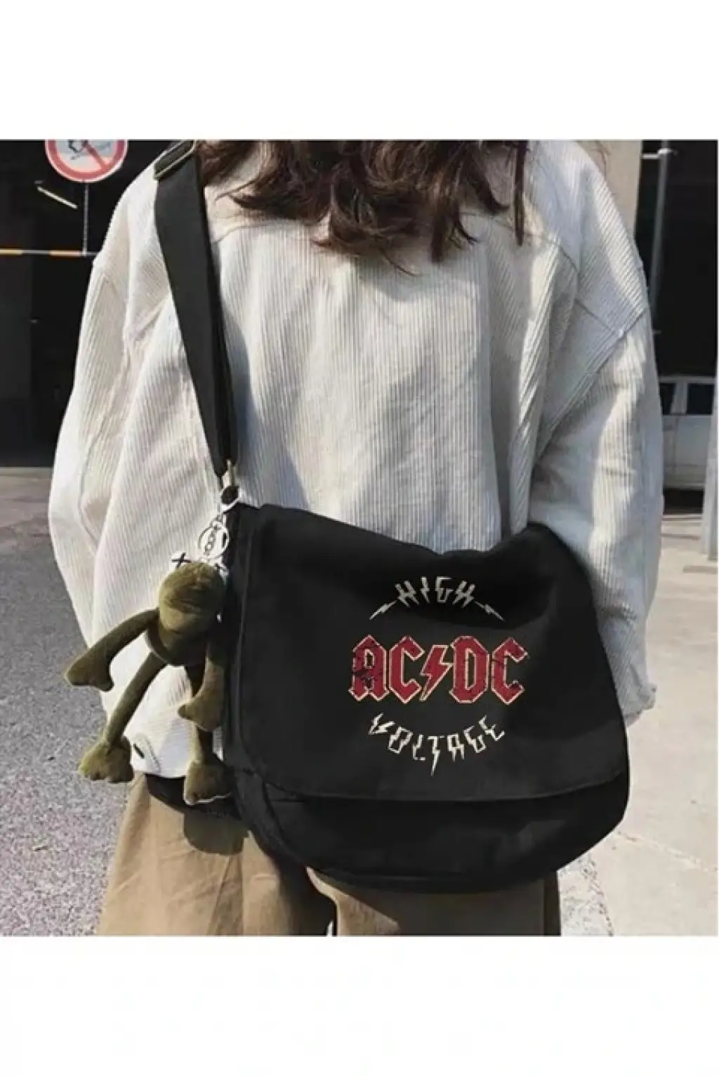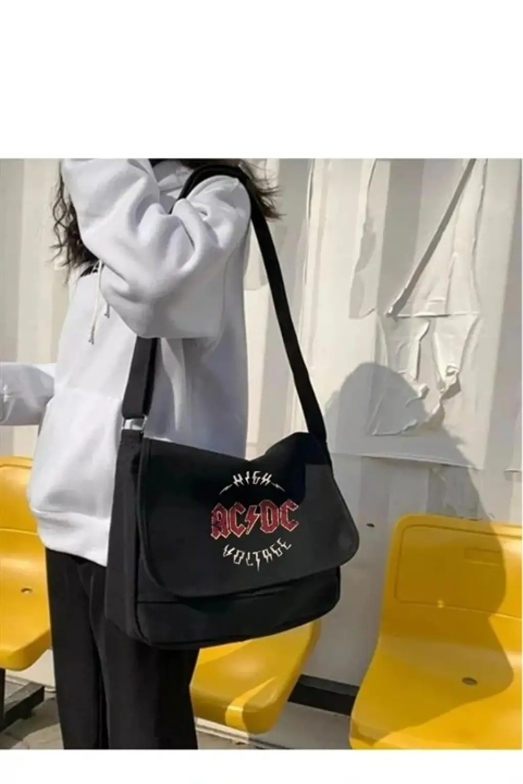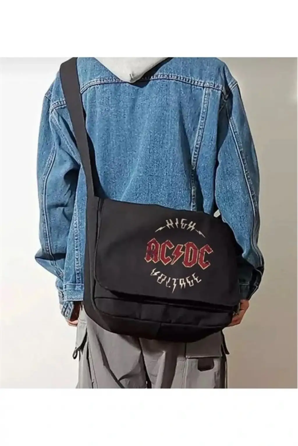 Touz Özel Koleksiyonu Postacı Çanta Serisi ; Rock Serisi AC/DC Baskılı Unisex Siyah Postacı Çantası