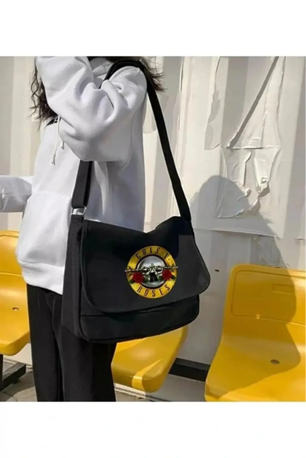 Touz Özel Koleksiyonu Postacı Çanta Serisi ; Rock Serisi Guns N' Roses Baskılı Unisex Siyah Postacı Çantası