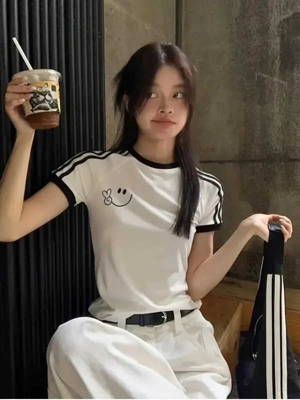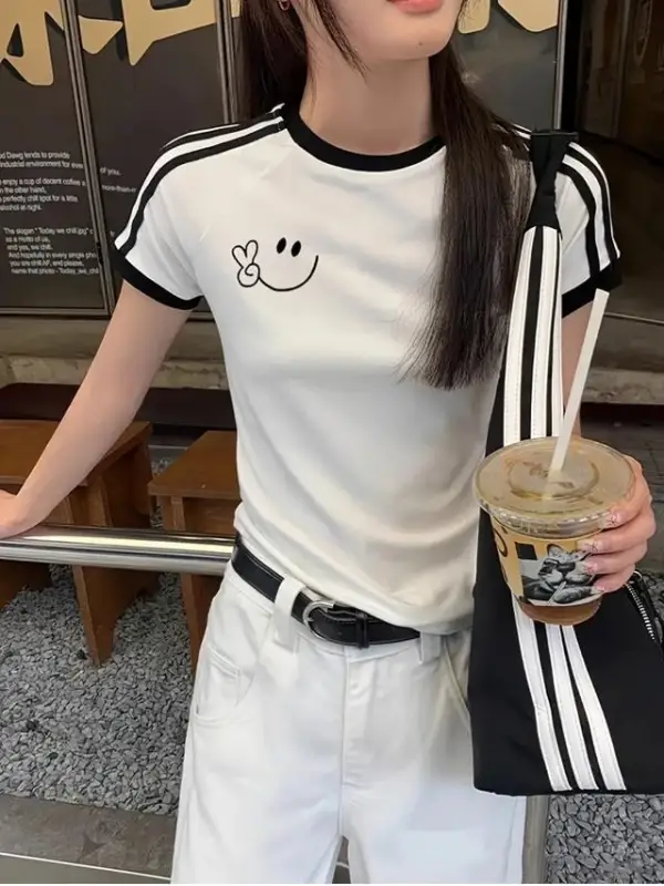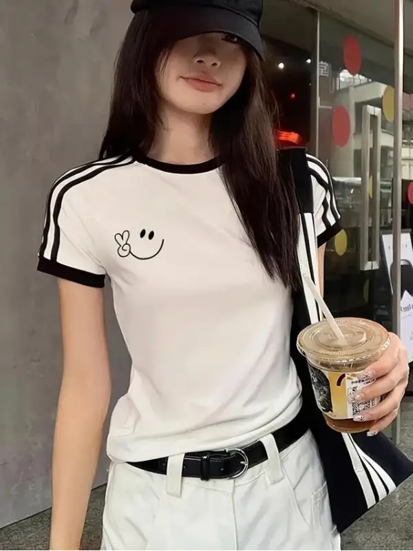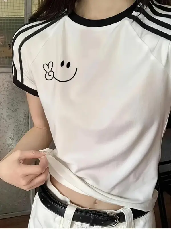 Toptan Smile Baskılı Şeritli Bluz Body Crop