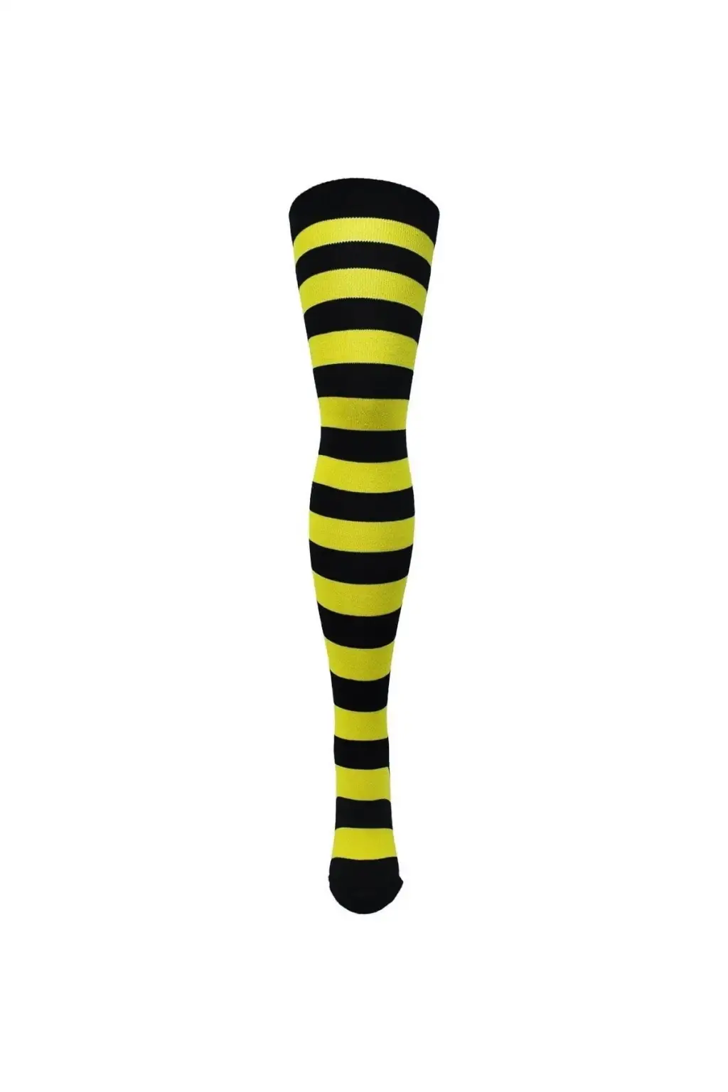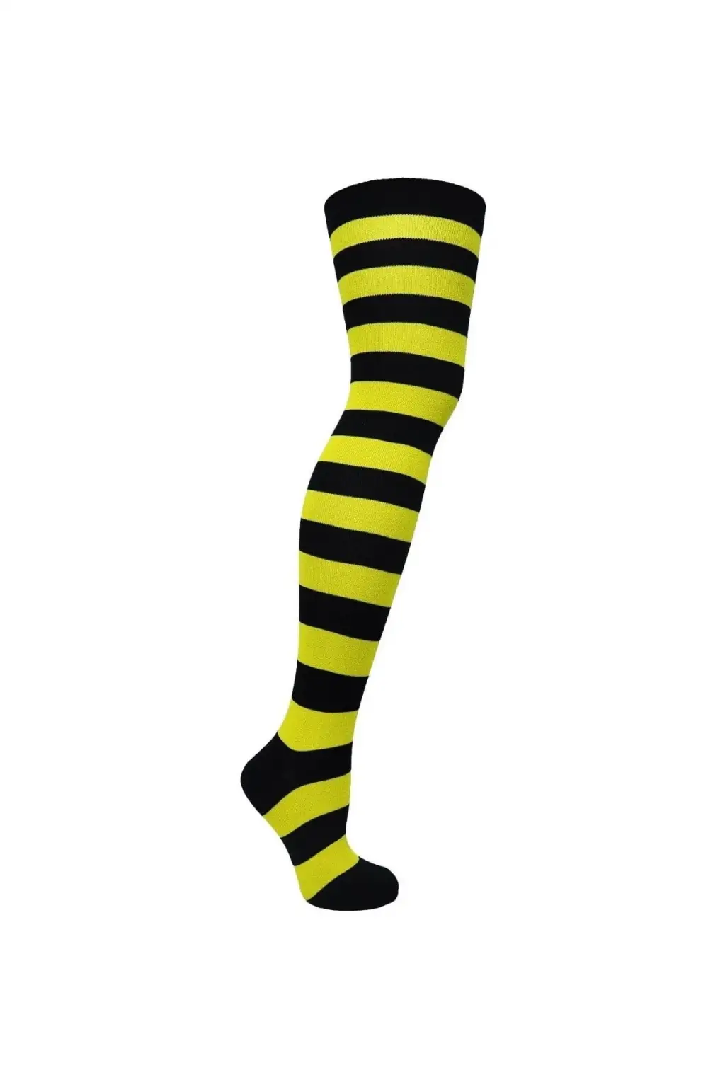Bu trendy ve şık siyah sarı çizgili pamuklu diz üstü çoraplarla tarzınızı tamamlayın.