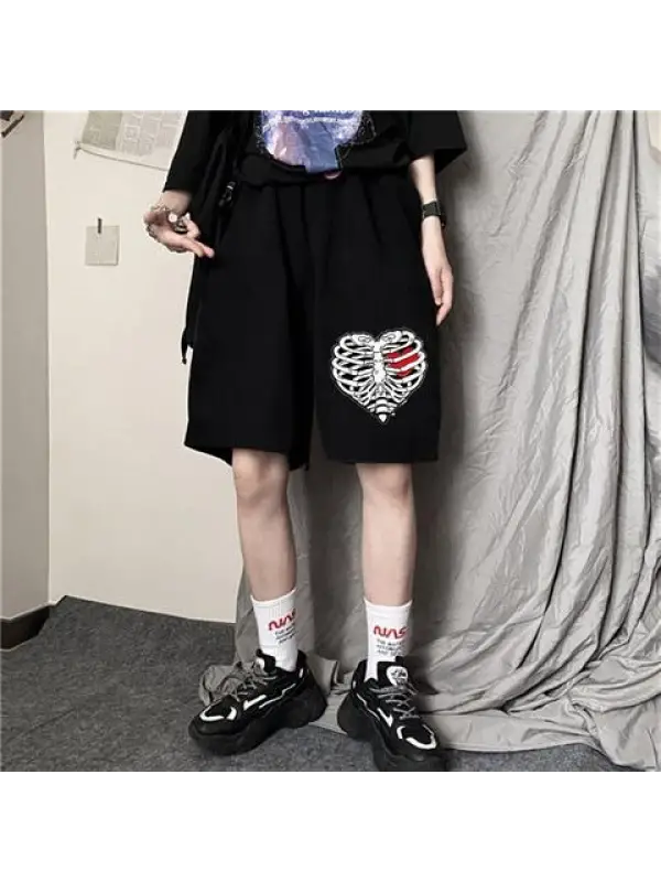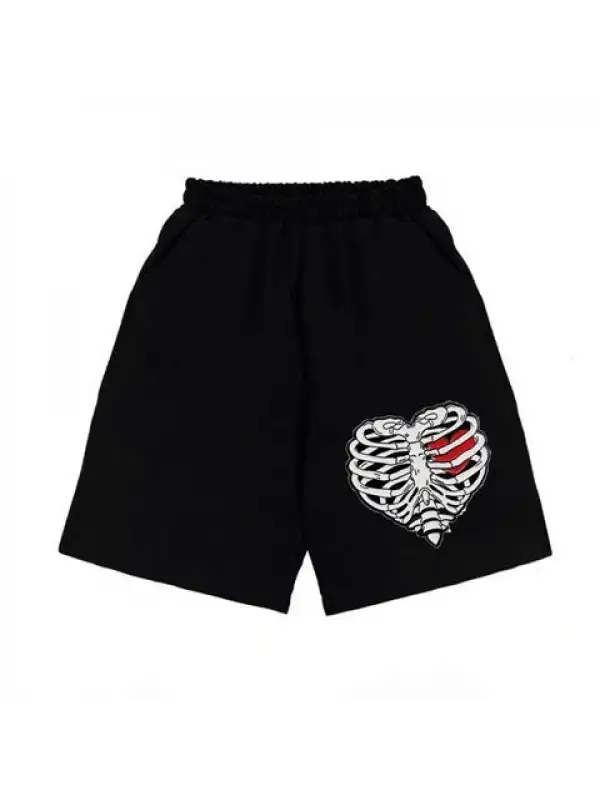 Heart Rib Baskılı Siyah Unisex Penye Şort