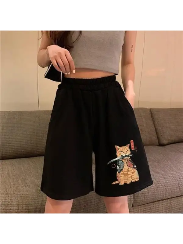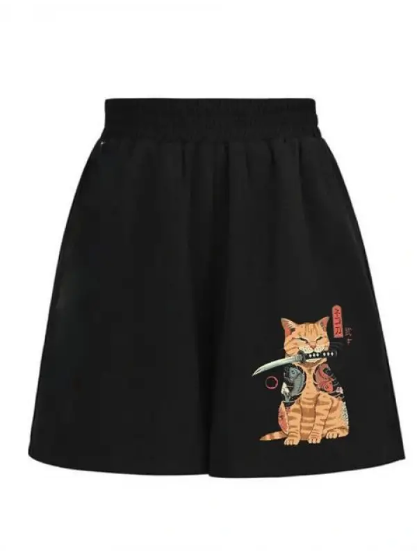 Killer Cat Baskılı Siyah Unisex Penye Şort