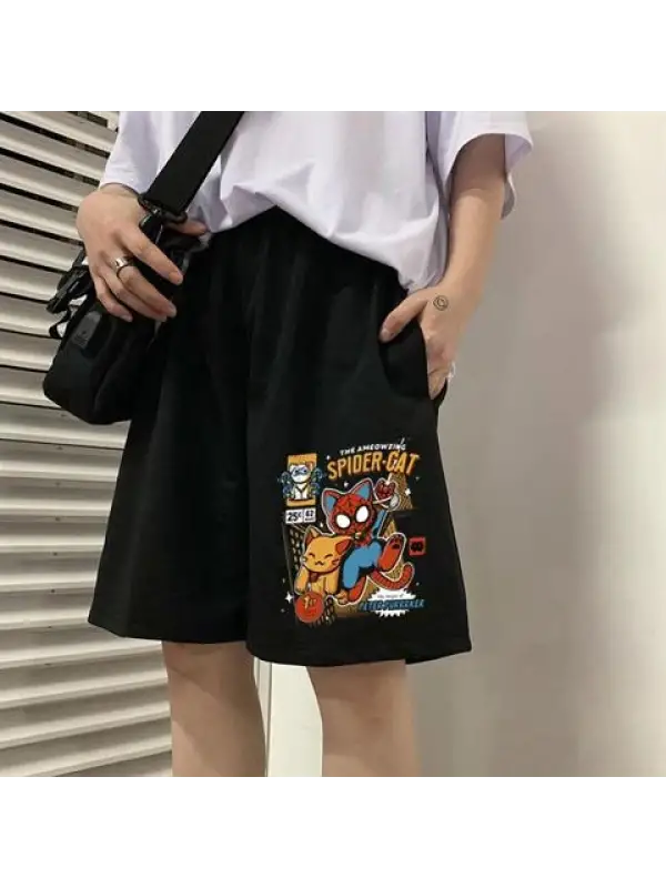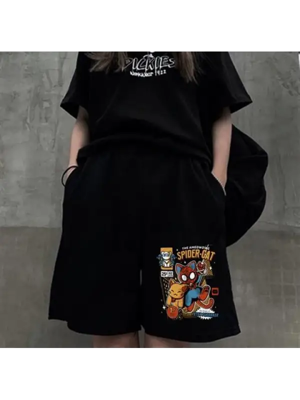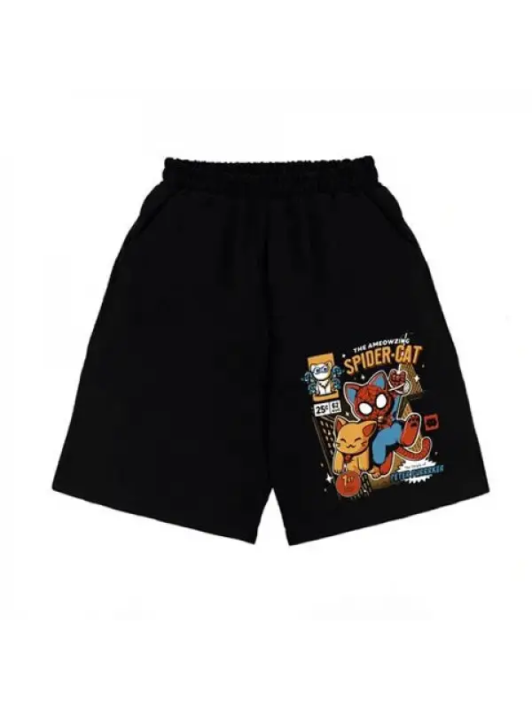 Spider-Cat Baskılı Siyah Unisex Penye Şort