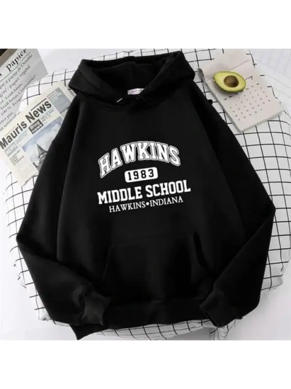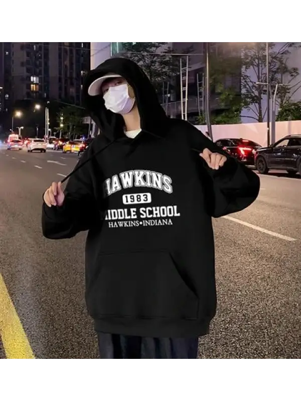 Hawkins Baskılı Siyah Unisex Oversize Kapüşonlu Sweatshirt