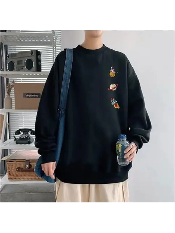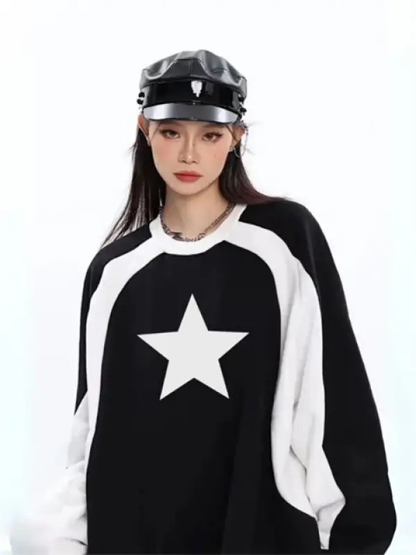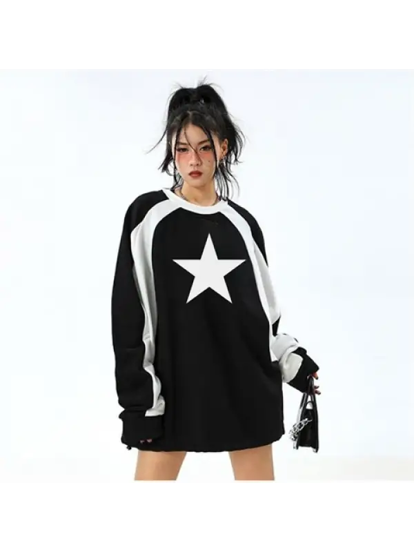 Y2K Streetwear Star Baskılı Siyah Unisex Oversize Bisiklet Yaka Sweatshirt