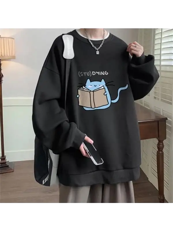 Studying Baskılı Gri Unisex Oversize Bisiklet Yaka Sweatshirt
