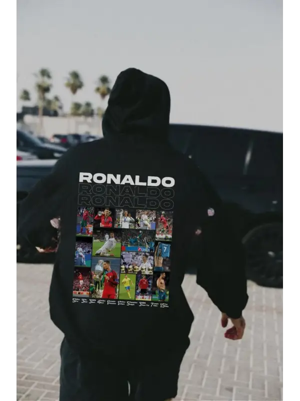Ronaldo Baskılı Siyah Kapşonlu Sweatshirt