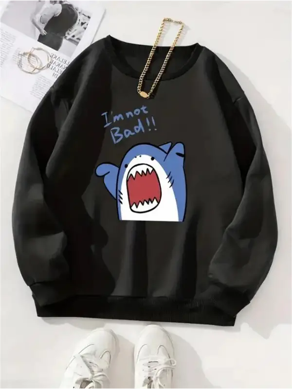 Shark Baskılı Siyah Unisex Oversize Bisiklet Yaka Sweatshirt