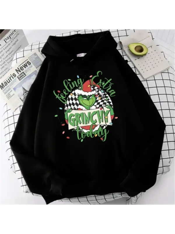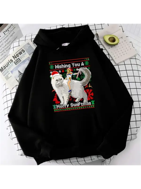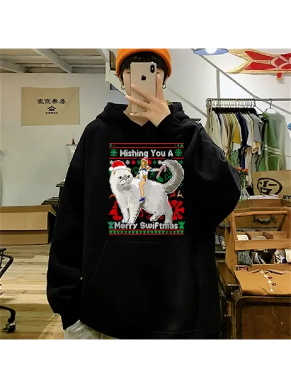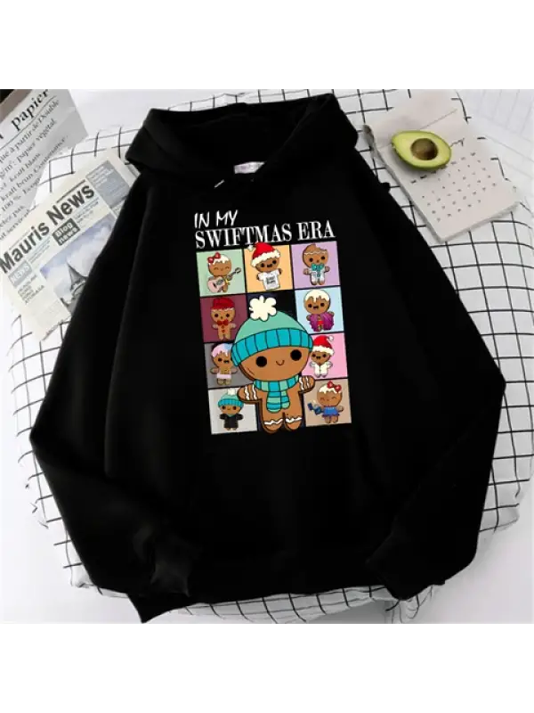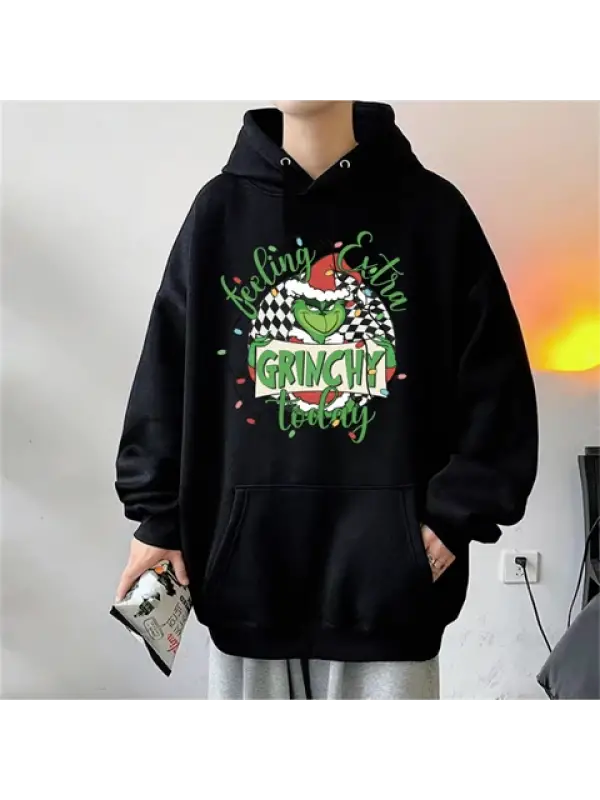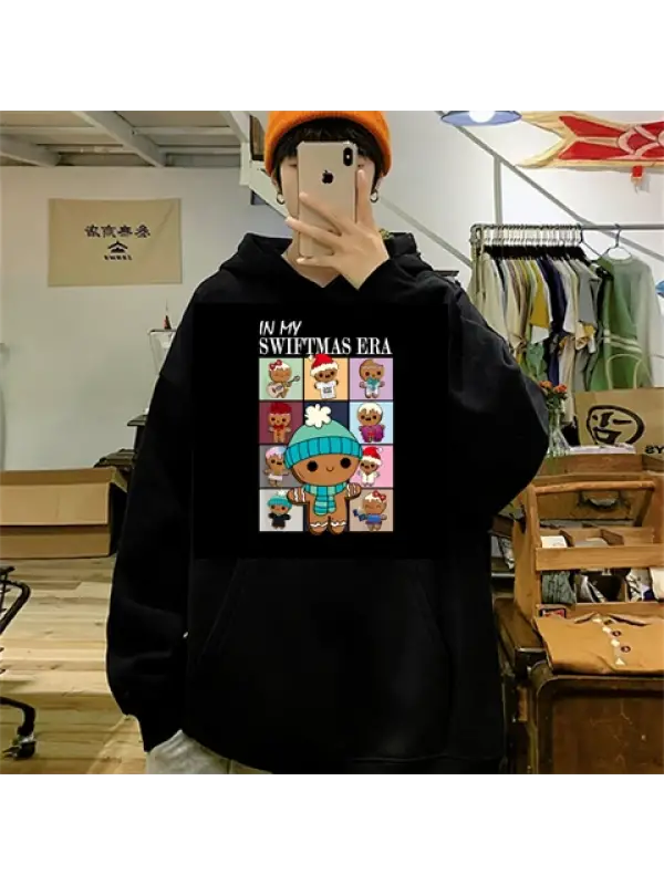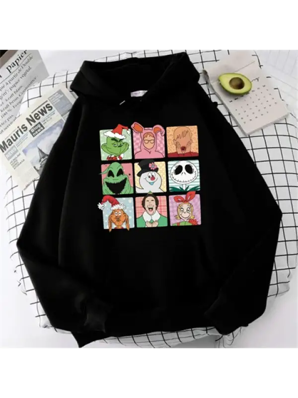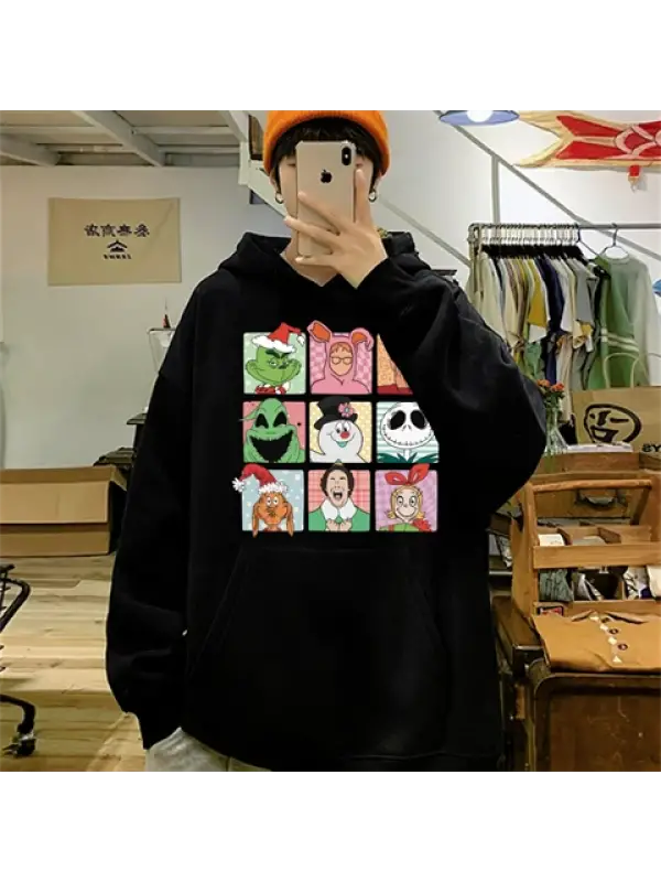 Yılbaşı Karakter Baskılı Siyah Unisex Oversize Kapüşonlu Sweatshirt