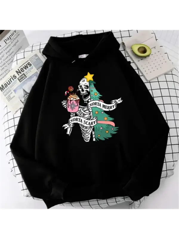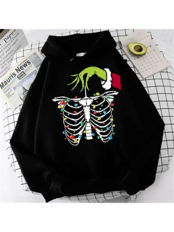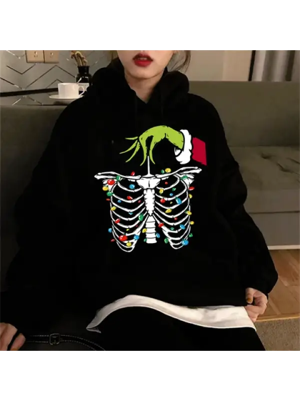 Skeleton Noel Baskılı Siyah Unisex Oversize Kapüşonlu Sweatshirt