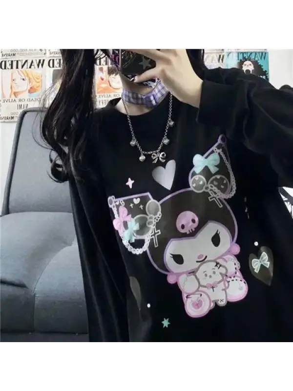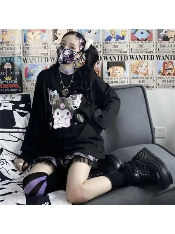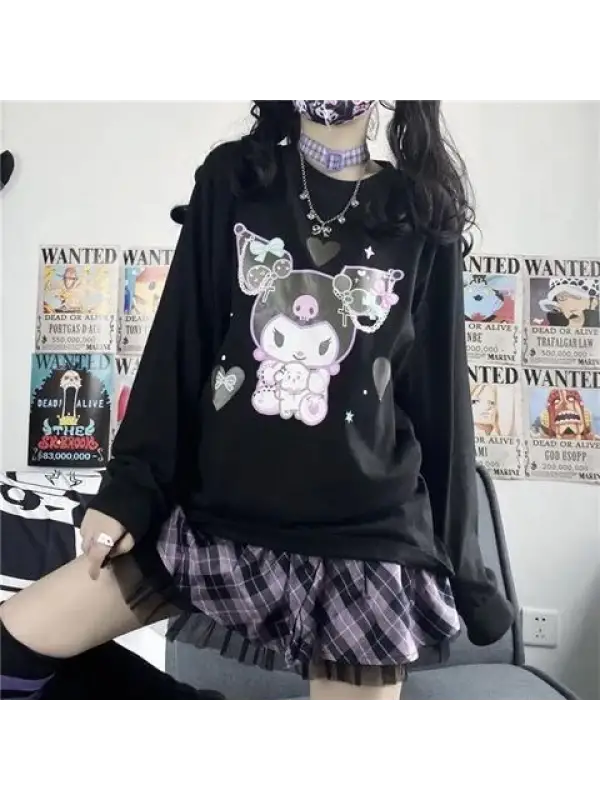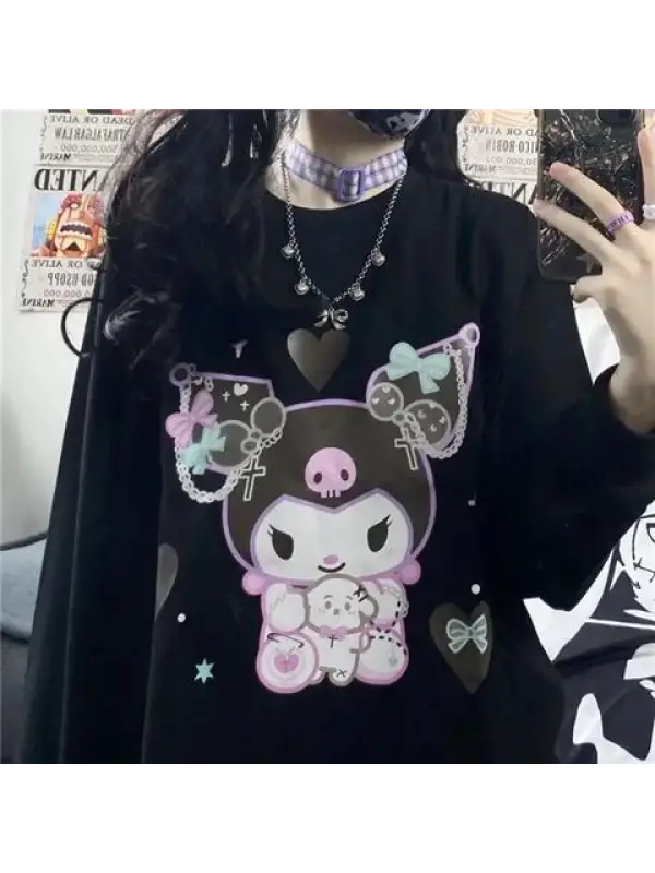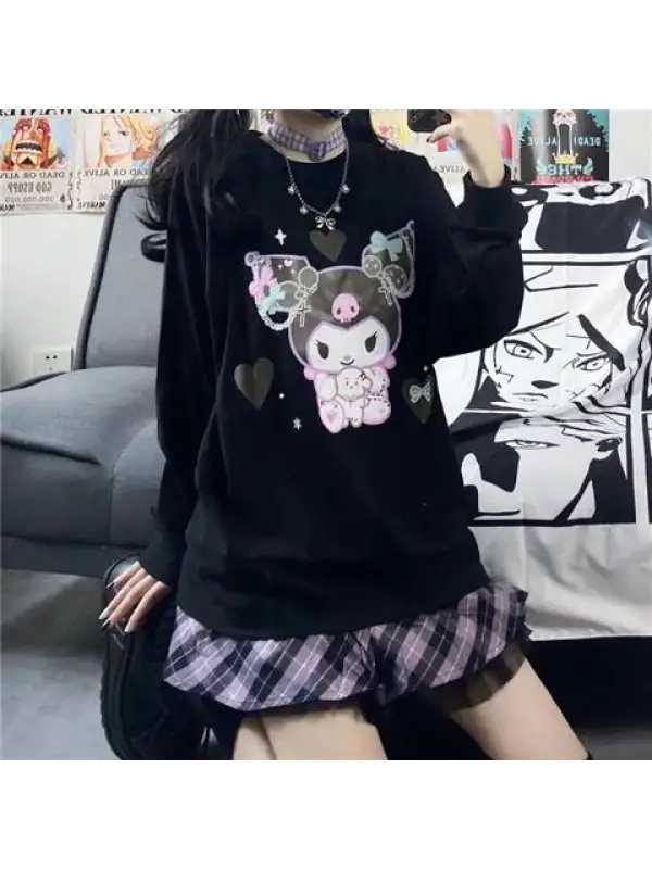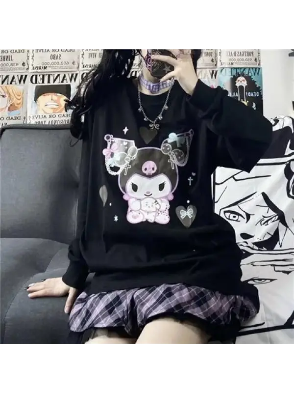 Harajuku Kuromi Baskılı Siyah Unisex Oversize Bisiklet Yaka Sweatshirt