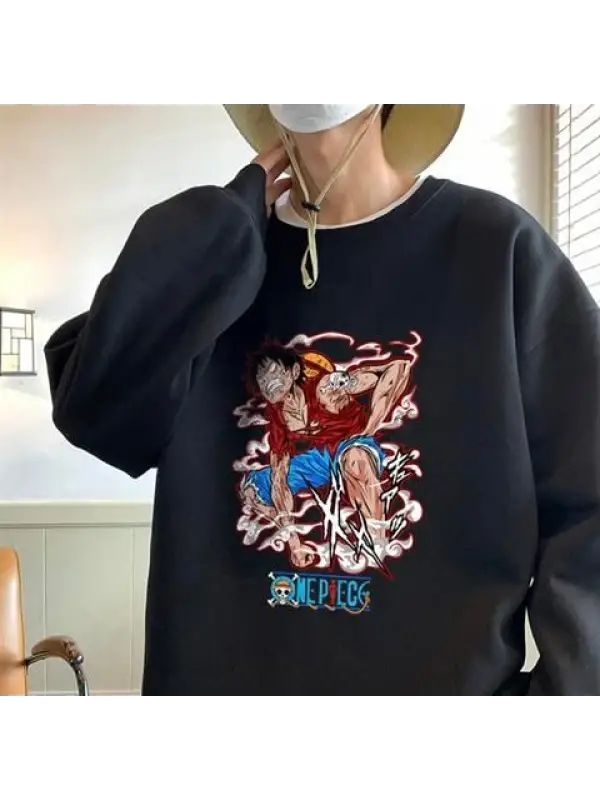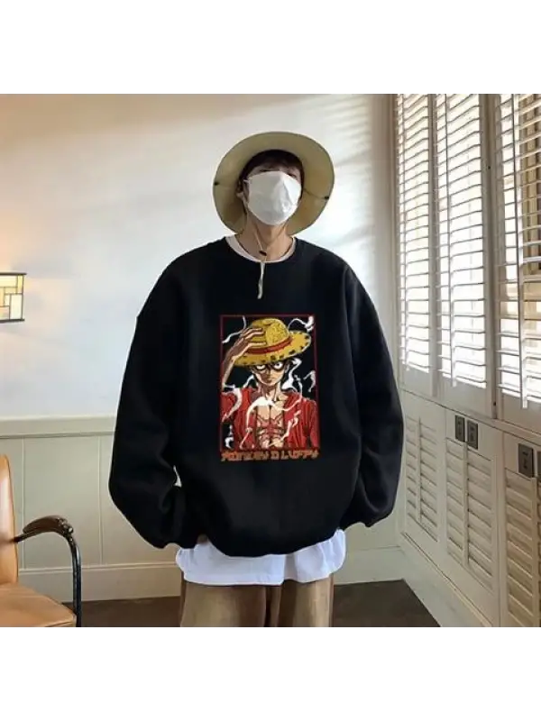 One Piece Monkey D Luffy Baskılı Siyah Unisex Oversize Bisiklet Yaka Sweatshirt