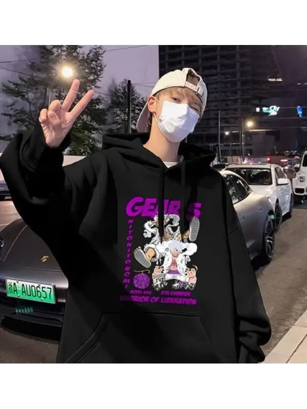 One Piece Gear 5 Baskılı Siyah Unisex Oversize Kapüşonlu Sweatshirt