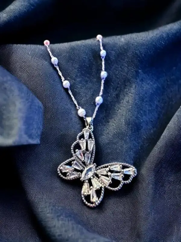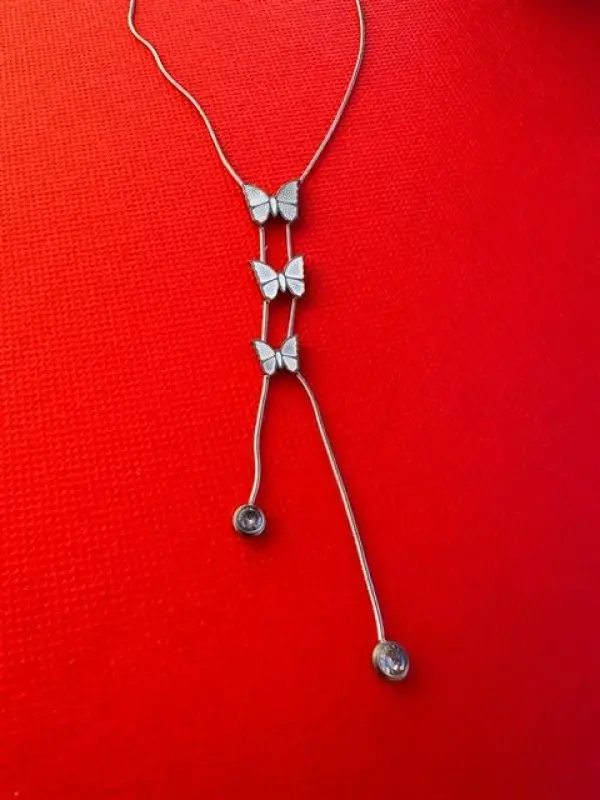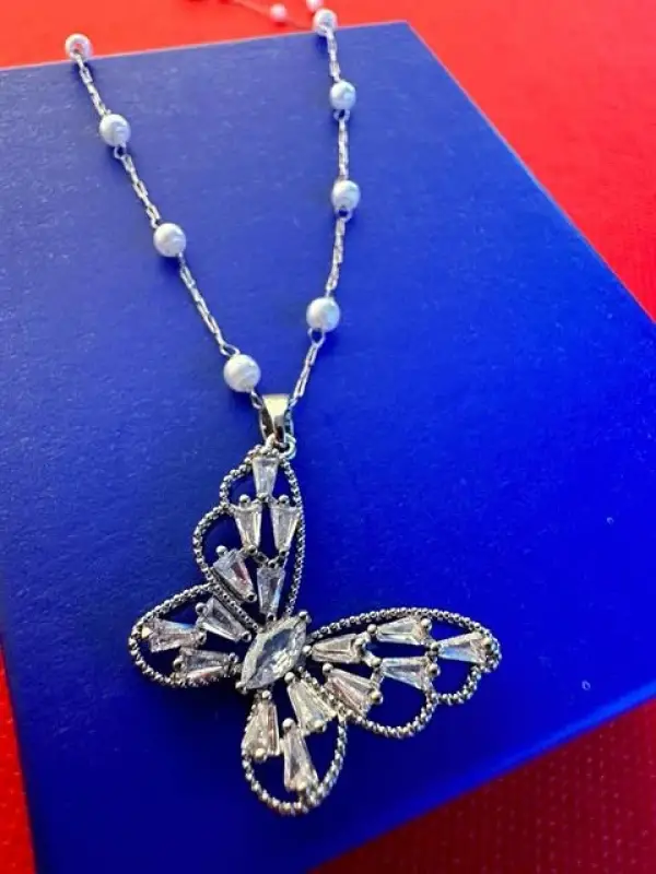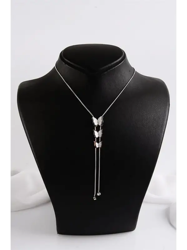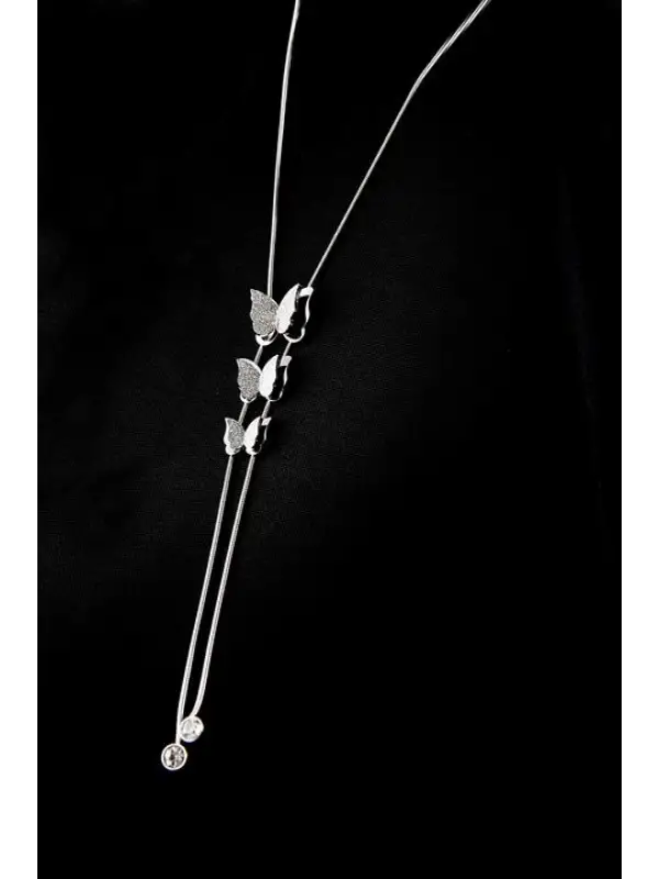 Çelik Gümüş Renk Butterfly İnci Kolye