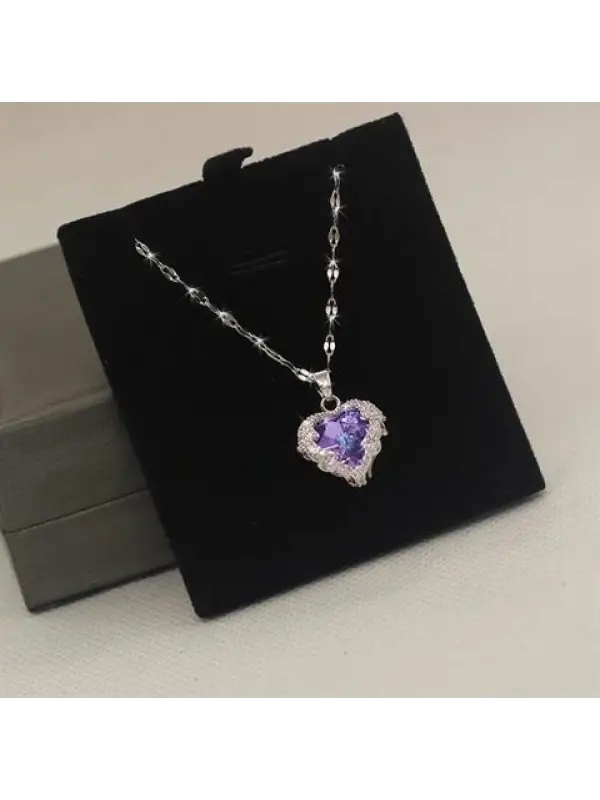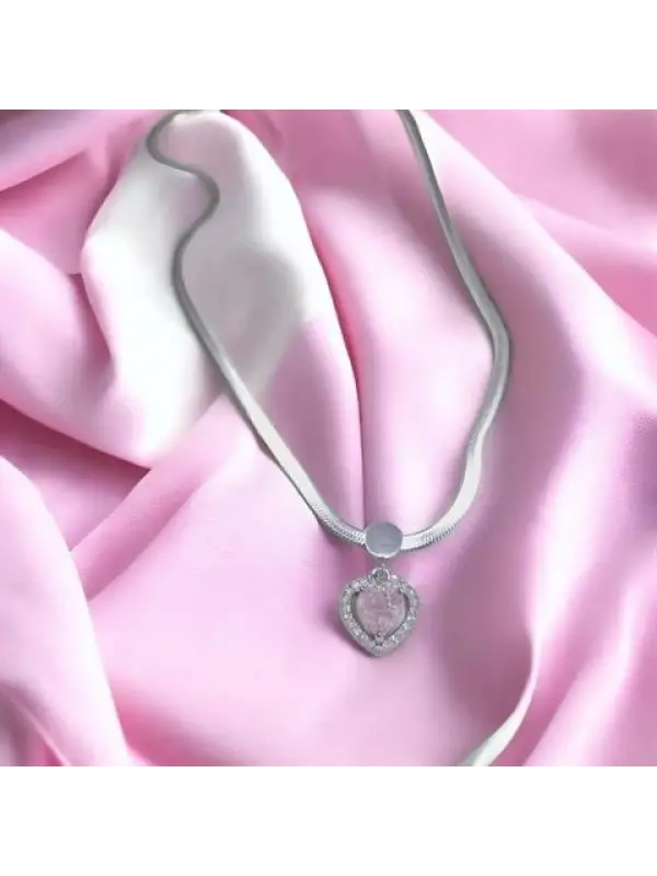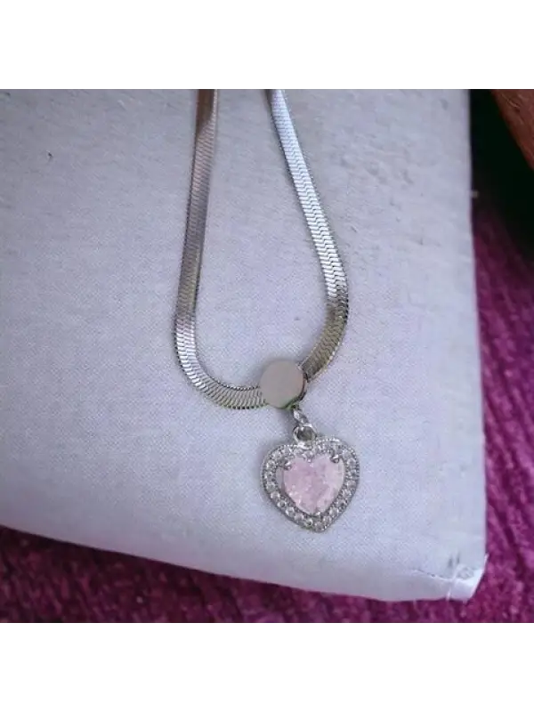 Çelik Zirkon Taşlı Pembe Kalpli Gümüş Renk Ezme Zincir Kolye