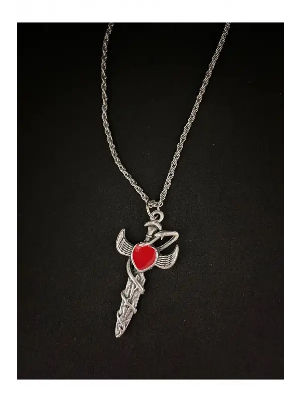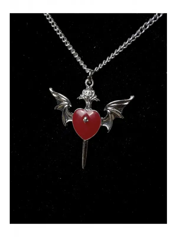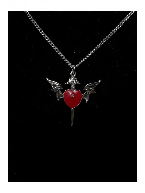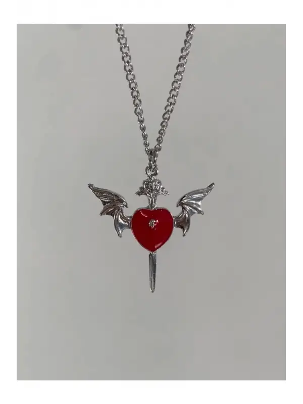 Antik Gümüş Kaplama Kanatlı Kuru Kafalı Kırmızı Kalp Kolye