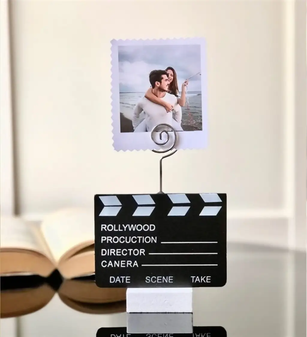 Harika klaket tasarımlı not ve fotoğraf tutucu.
