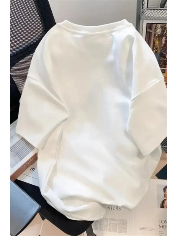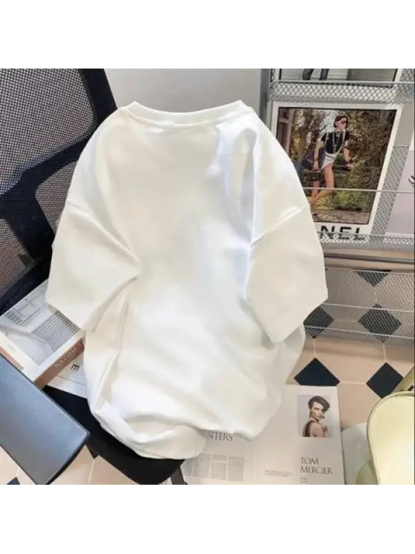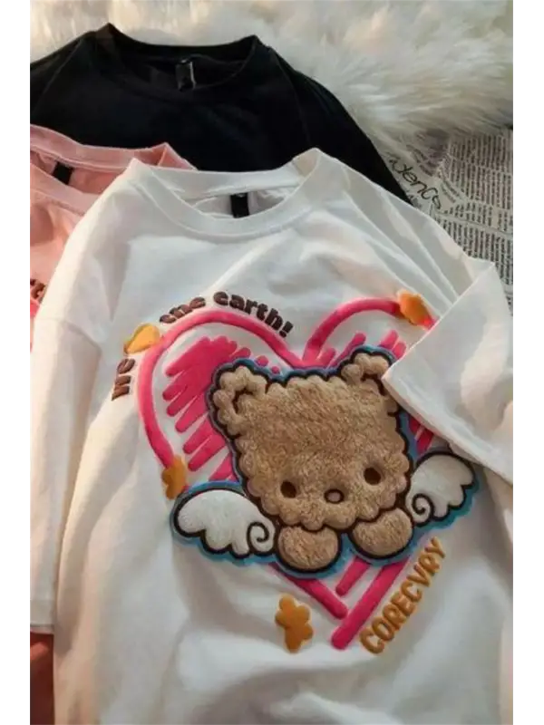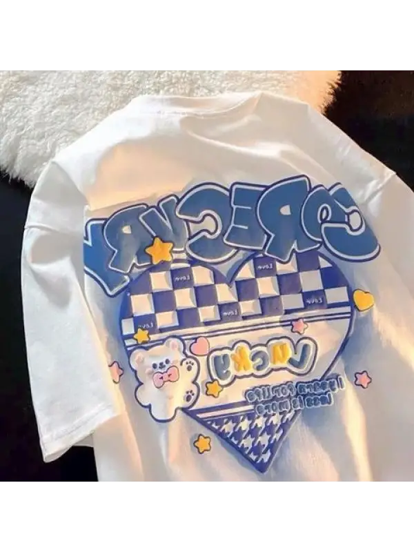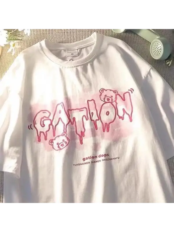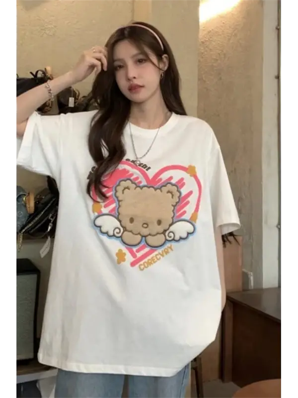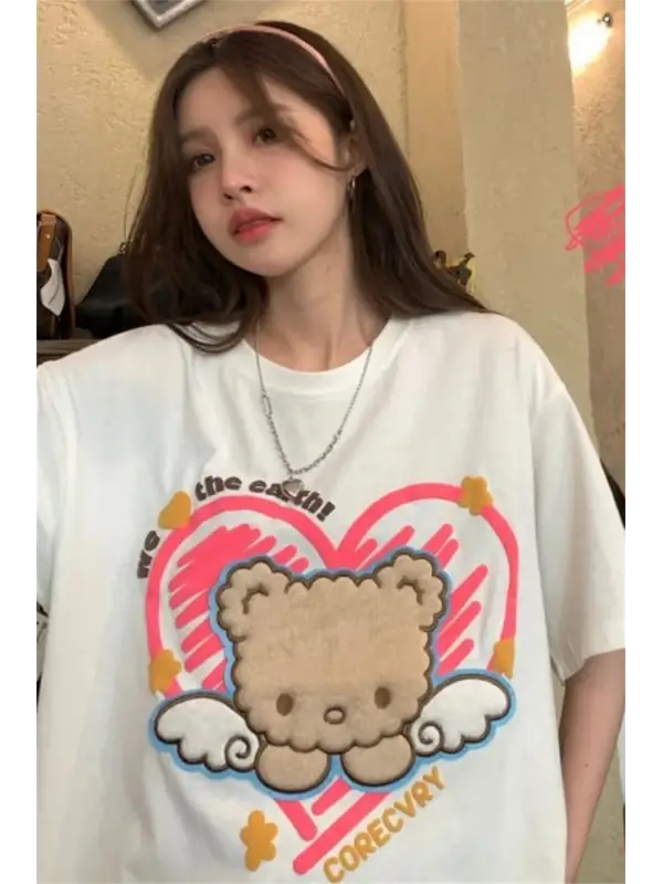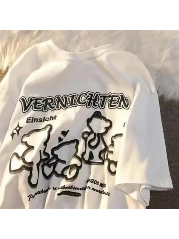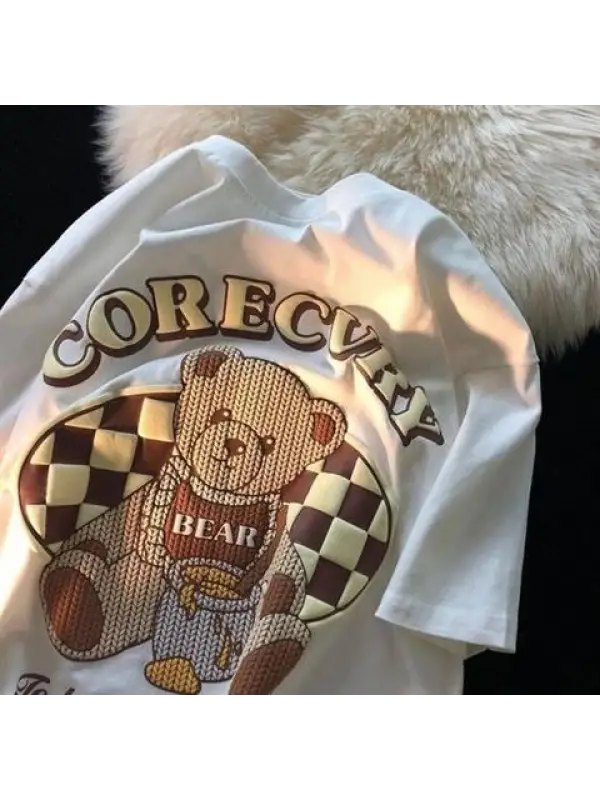 Retro Cute Bear Baskılı Beyaz Unisex Oversize T-Shirt