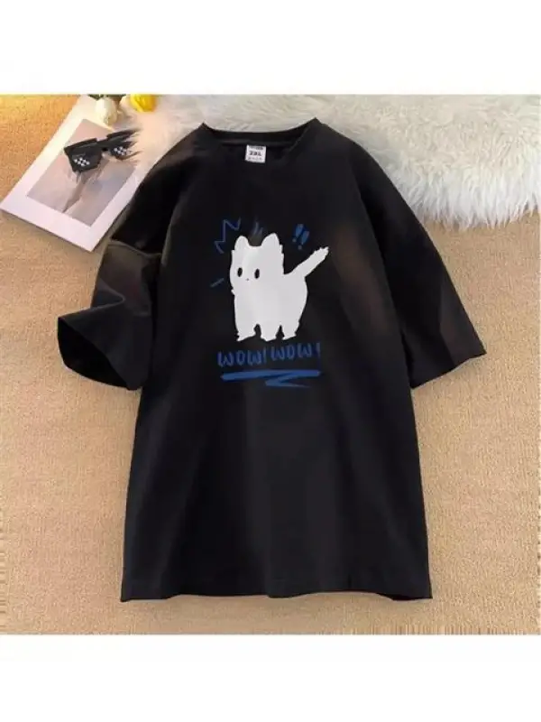 Minimalist Cat Baskılı Beyaz Unisex Oversize T-Shirt