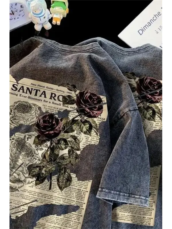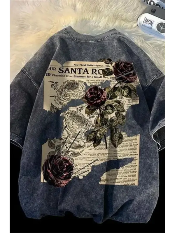 Yıkamalı Streetwear Rose Baskılı Unisex Oversize Vintage T-Shirt
