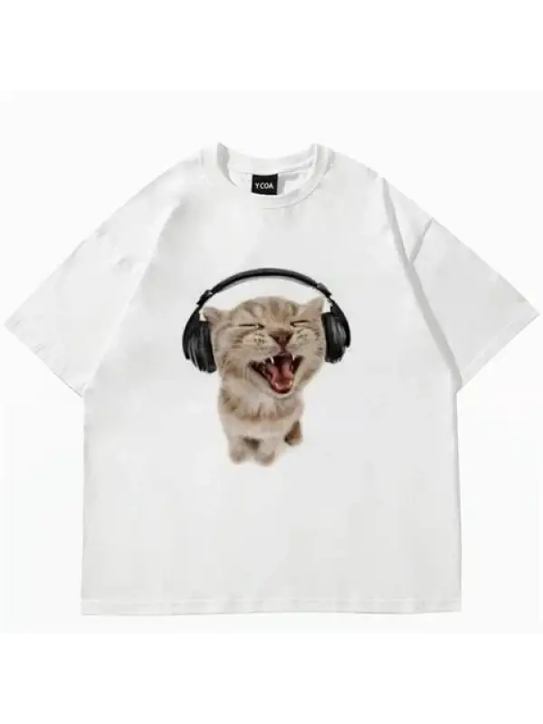 Y2k Kulaklıkla Müzik Dinleyen Kedi Baskılı Beyaz Unisex Oversize T-Shirt