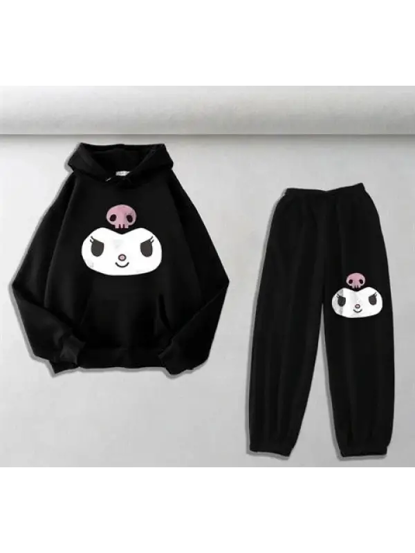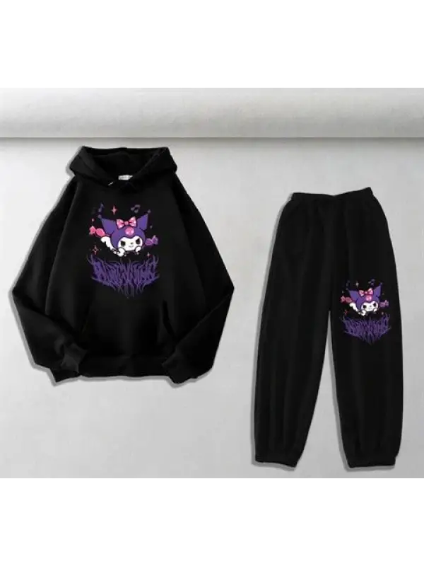 Harajuku Kuromi Baskılı Siyah Oversize Kapüşonlu Sweatshirt & Eşofman Altı Unisex İkili Takım