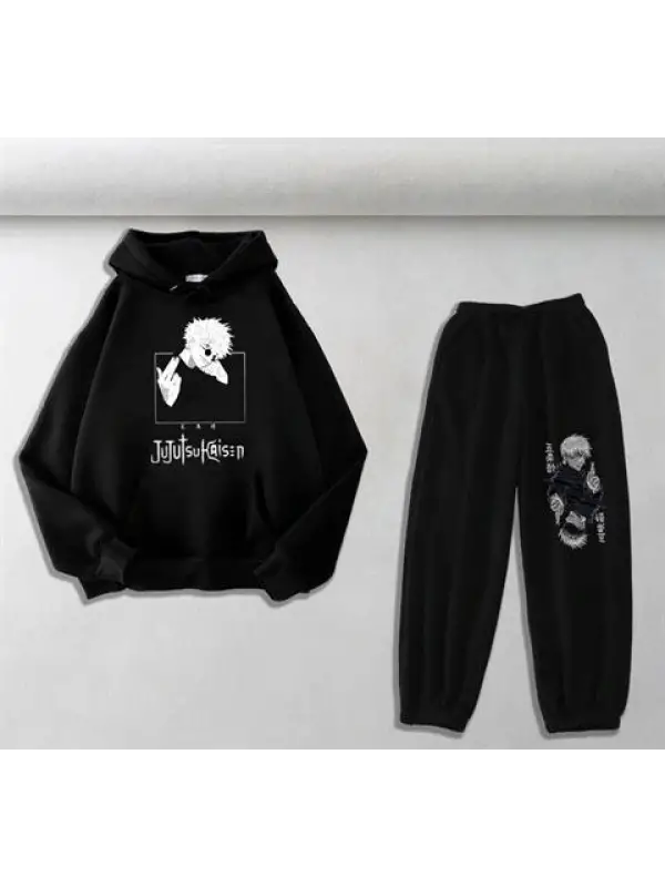 Jujutsu Kaisen Baskılı Siyah Oversize Kapüşonlu Sweatshirt & Eşofman Altı Unisex İkili Takım