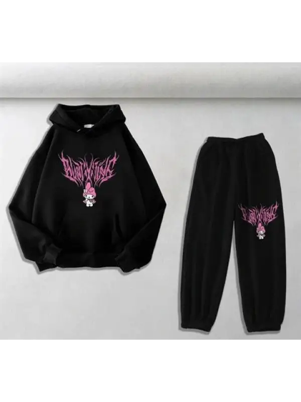 Melody Pink Baskılı Siyah Oversize Kapüşonlu Sweatshirt & Eşofman Altı Unisex İkili Takım