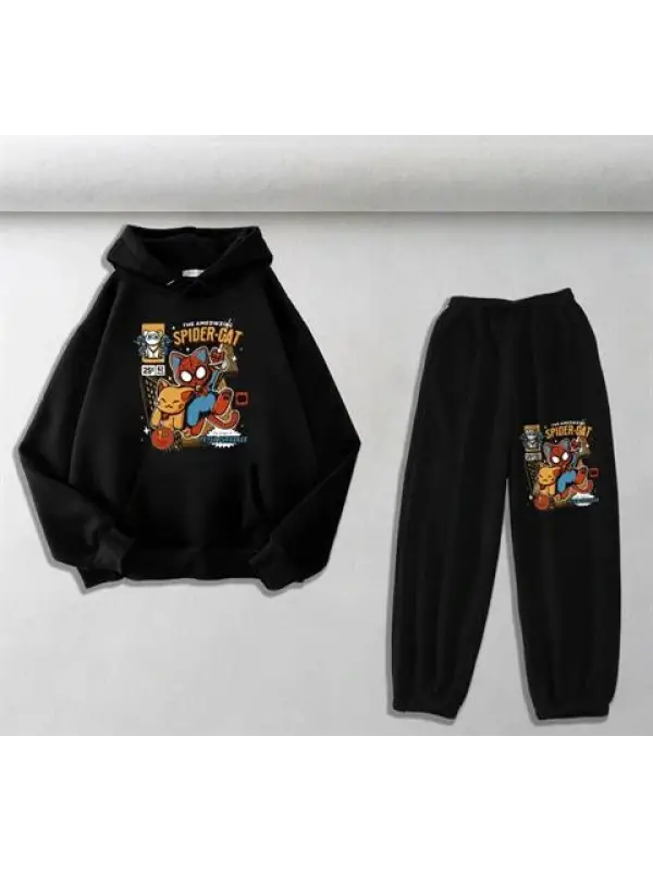 Spider-Cat Baskılı Siyah Oversize Kapüşonlu Sweatshirt & Eşofman Altı Unisex İkili Takım