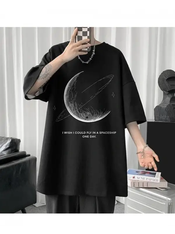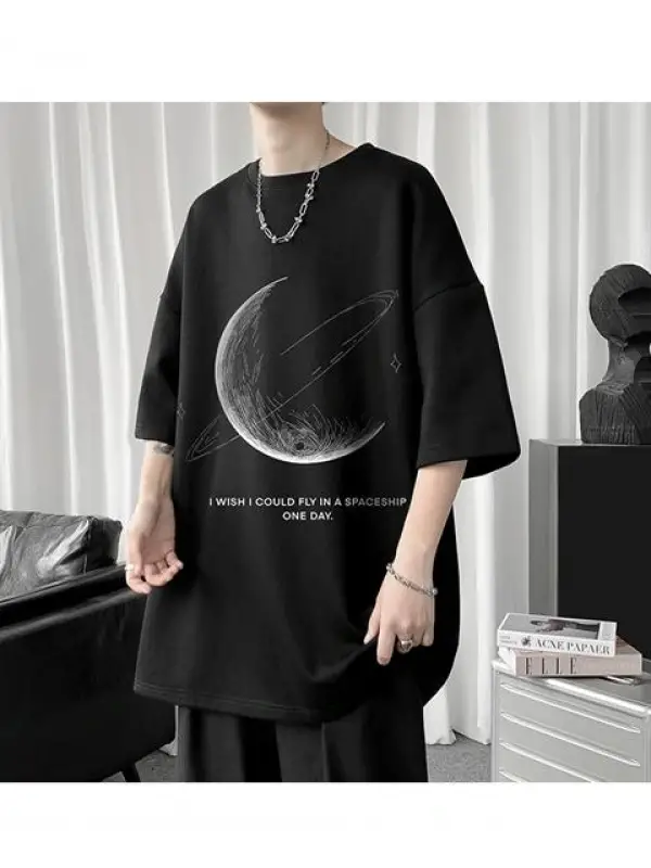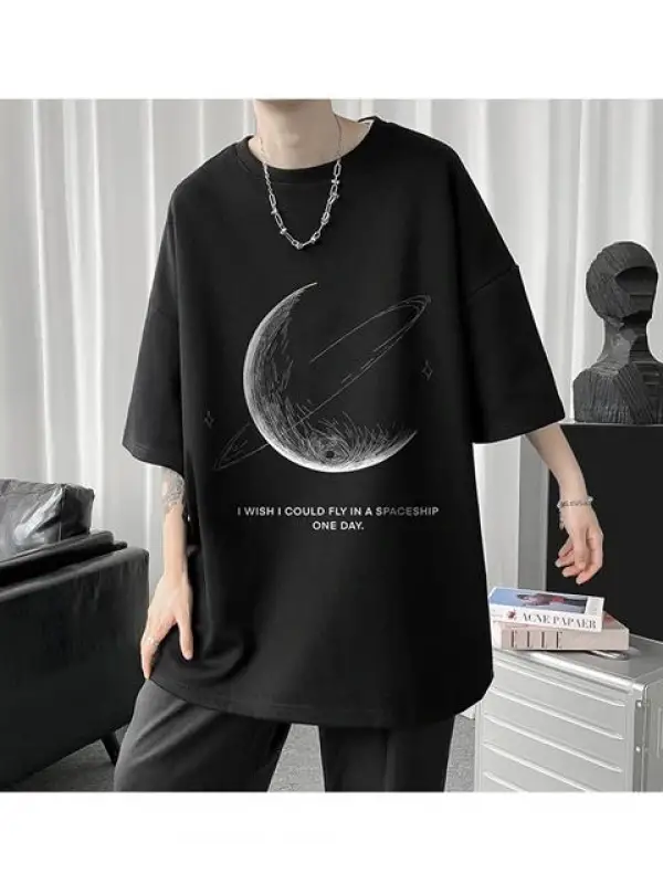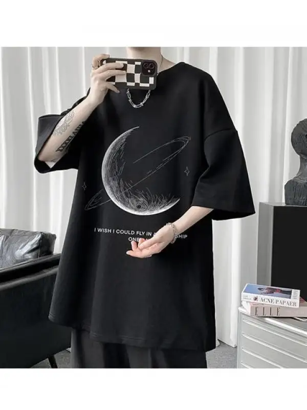 Crescent Saturn Baskılı Siyah Unisex Oversize T-Shirt