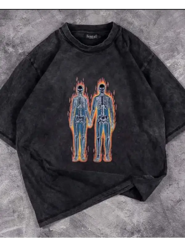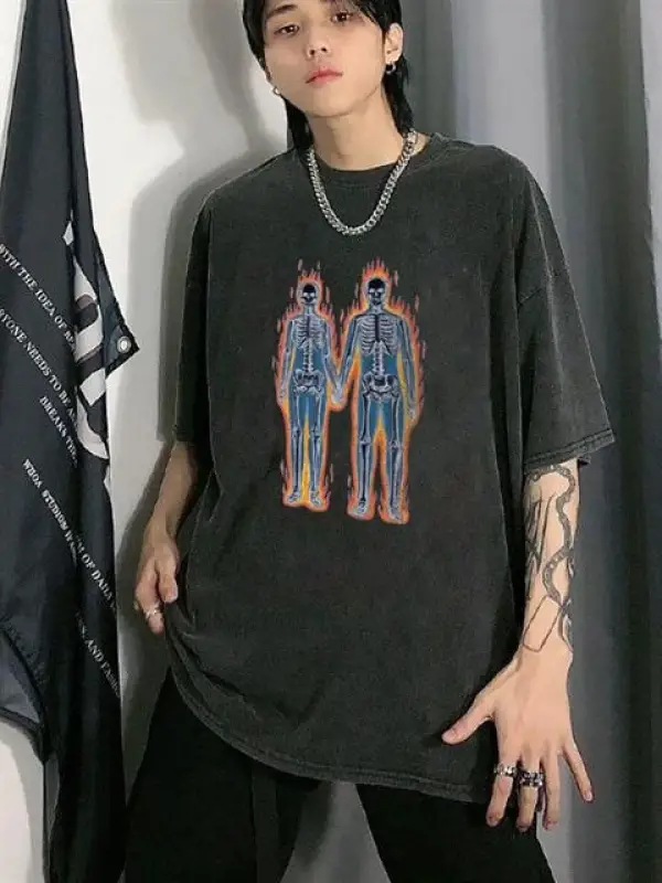 Yıkamalı Flaming Skeletons Baskılı Unisex Oversize Eskitme T-Shirt