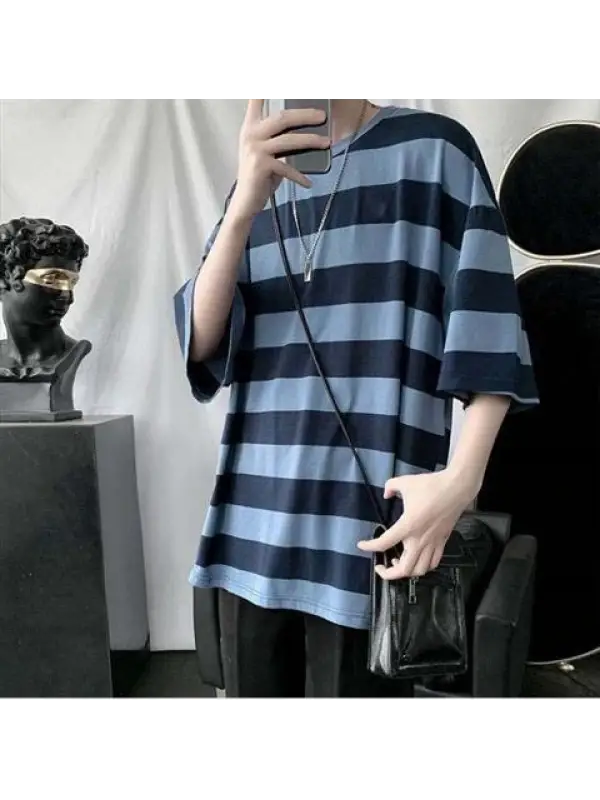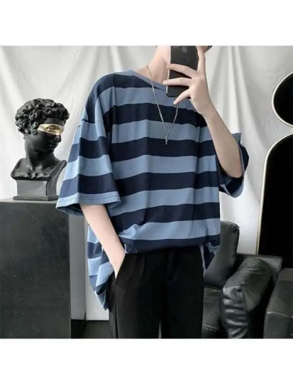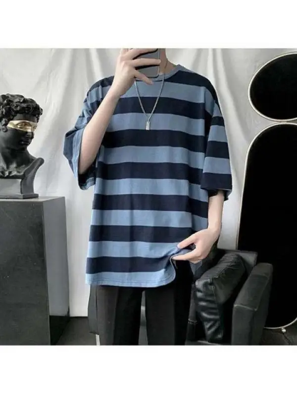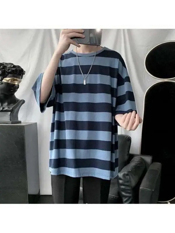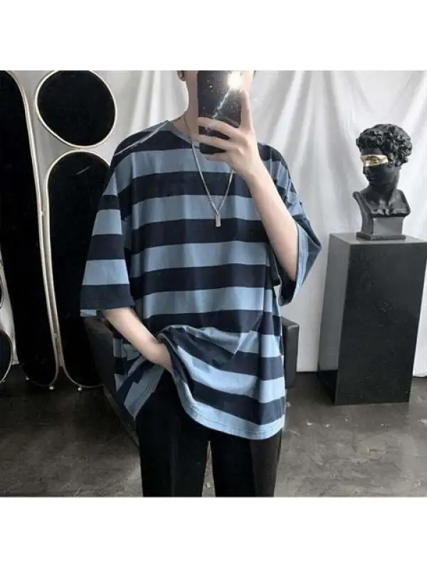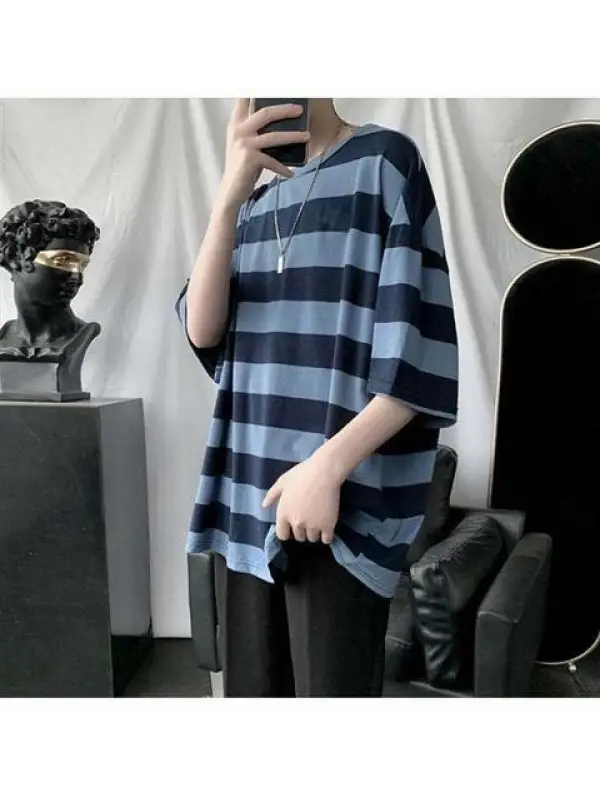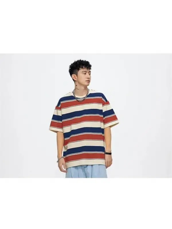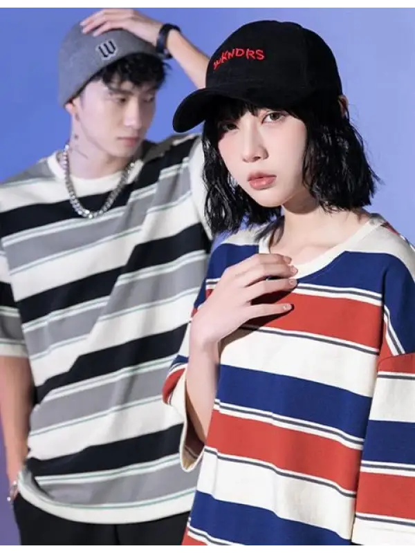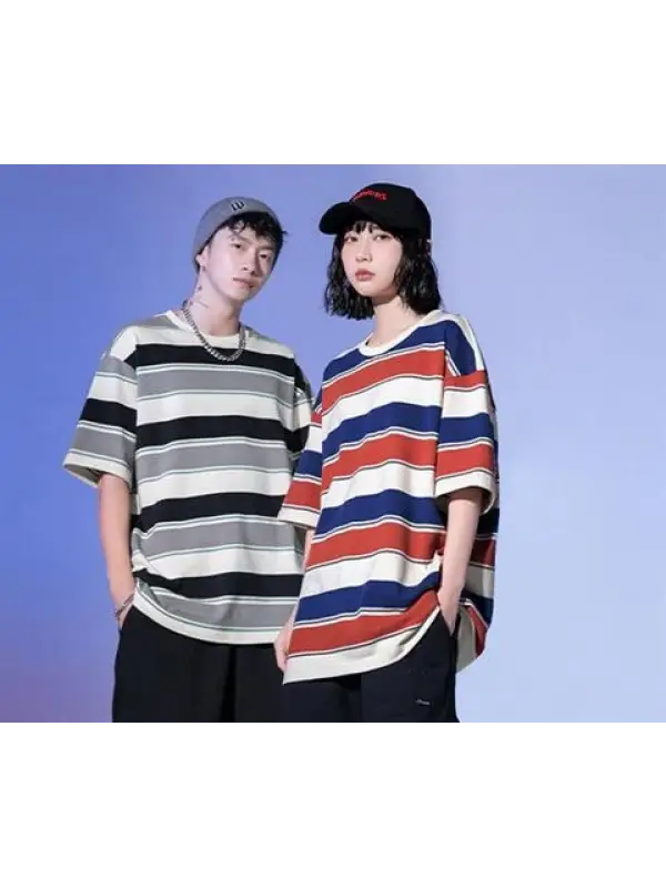 Kırmızı Mavi Çizgili Beyaz Unisex Oversize T-Shirt