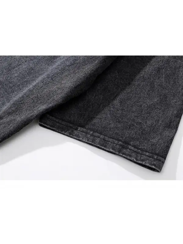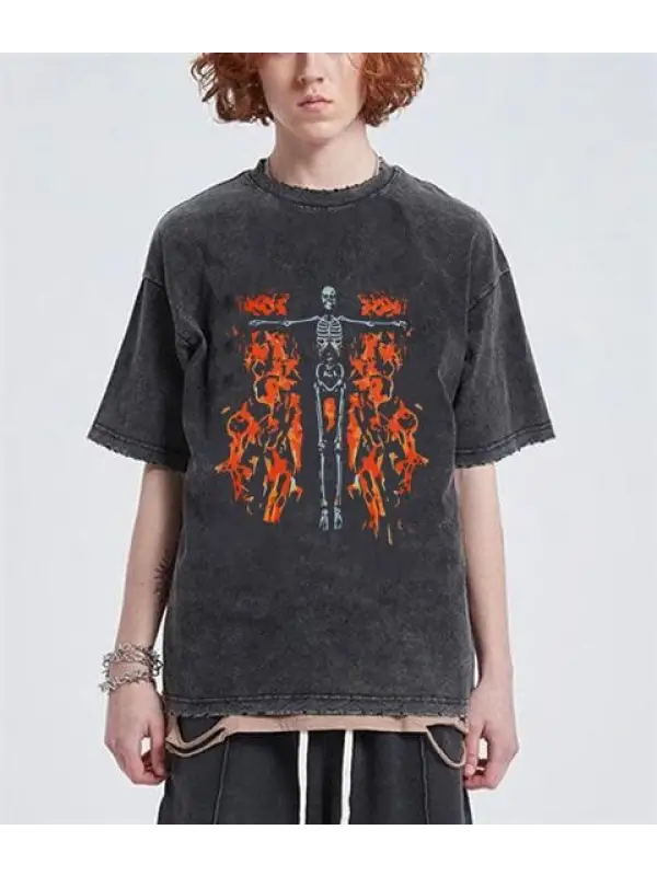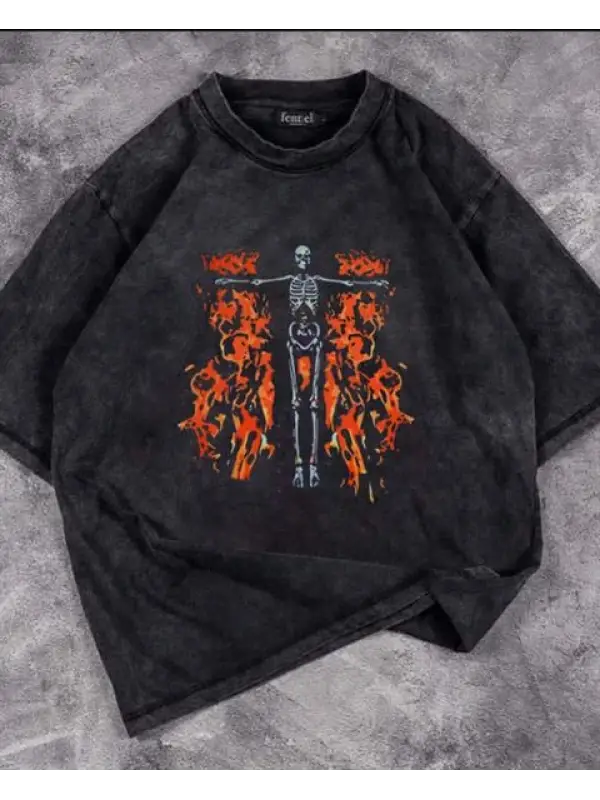 Yıkamalı Flaming Skeleton Baskılı Unisex Oversize Vintage Eskitme T-Shirt