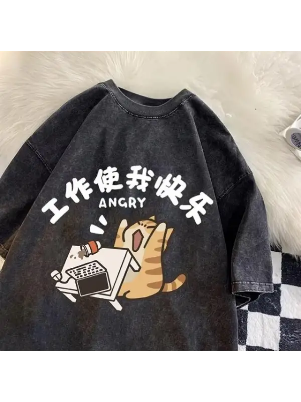 Yıkamalı Angry Cat Oversize Vintage T-Shirt