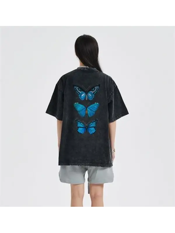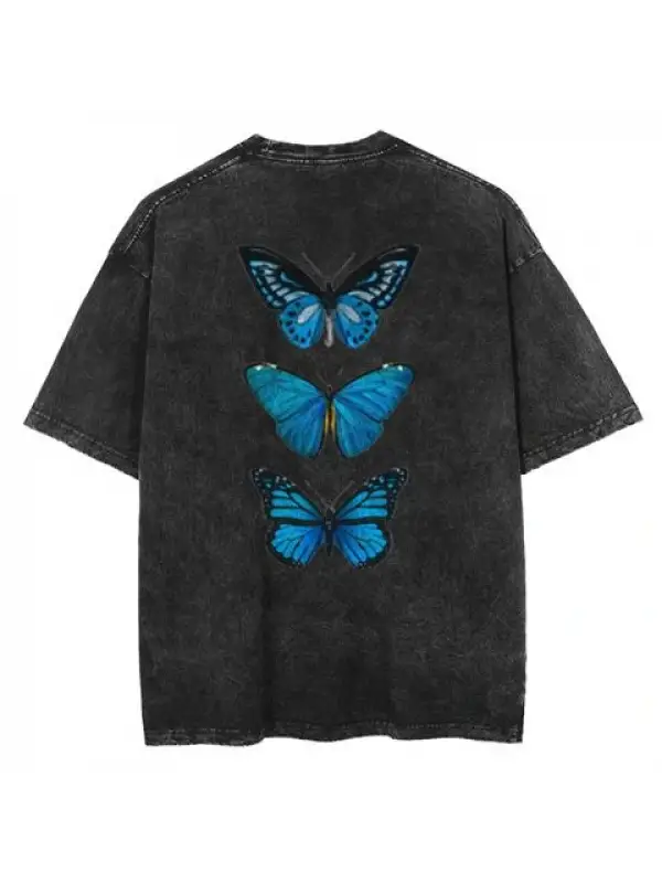 Triple Blue Butterfly Sırt Baskılı Unisex Eskitme T-Shirt