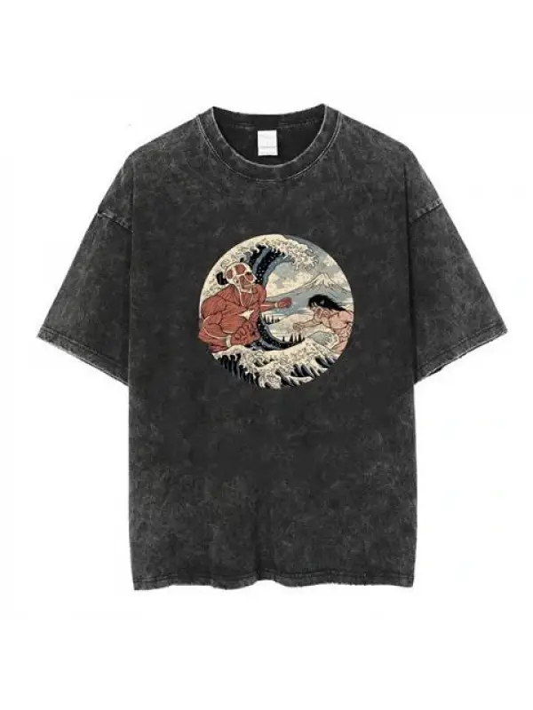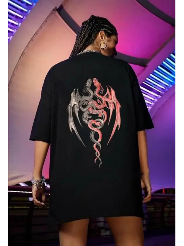 Twin Dragon Sırt Baskılı Unisex Eskitme T-Shirt