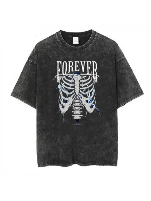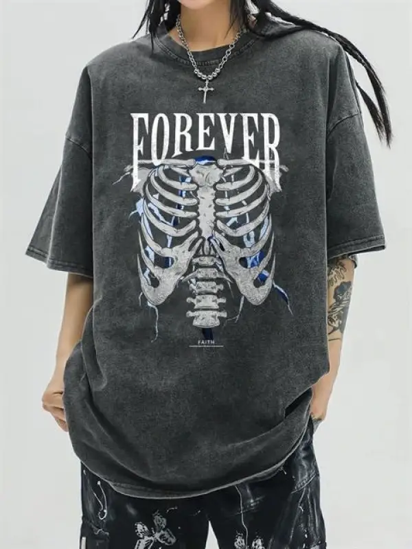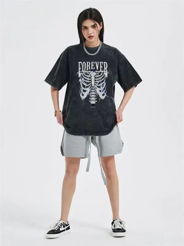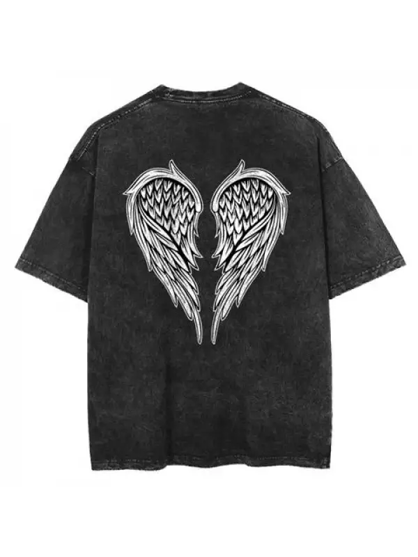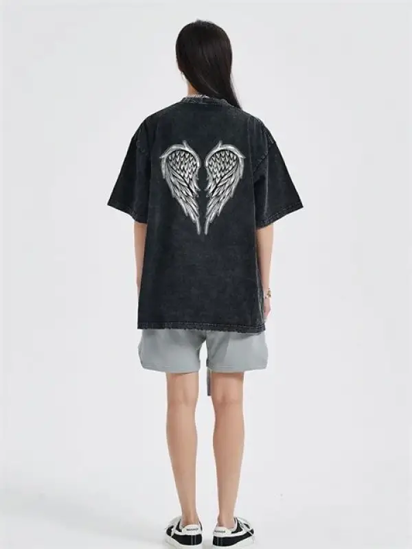 Yıkamalı Sırt Baskılı Wing Skeleton Unisex Eskitme T-Shirt