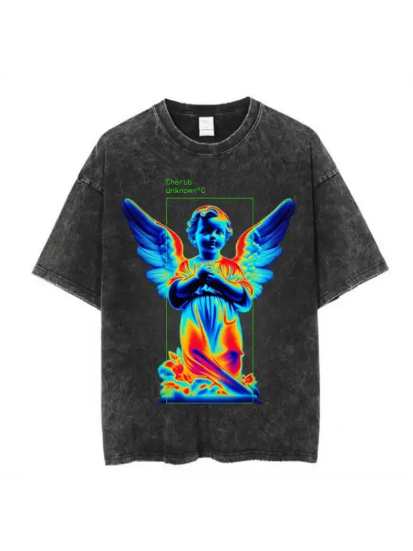 Yıkamalı Angel Baskılı Unisex Oversize Vintage T-Shirt