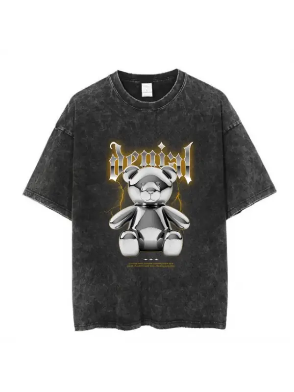 Yıkamalı Bear Baskılı Unisex Oversize Vintage T-Shirt